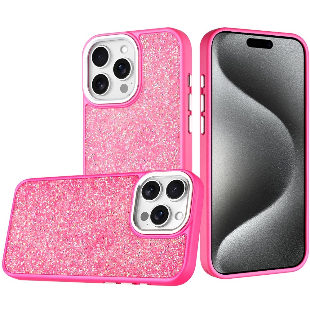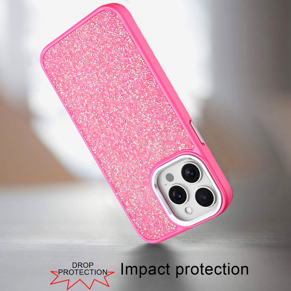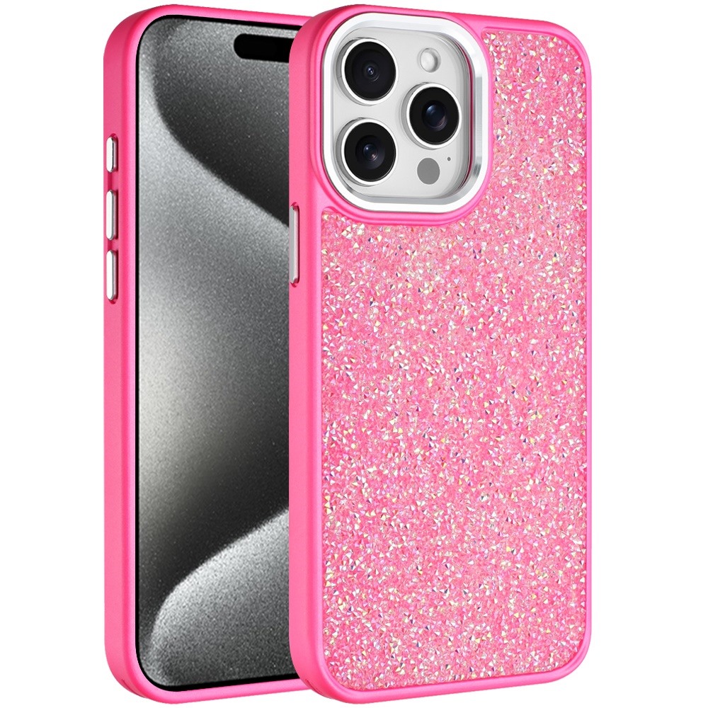 For iP15 Pro Max Crystal Glass Diamond with Metallic Buttons and Edges Hybrid Case - Hot Pink