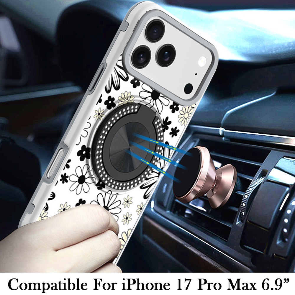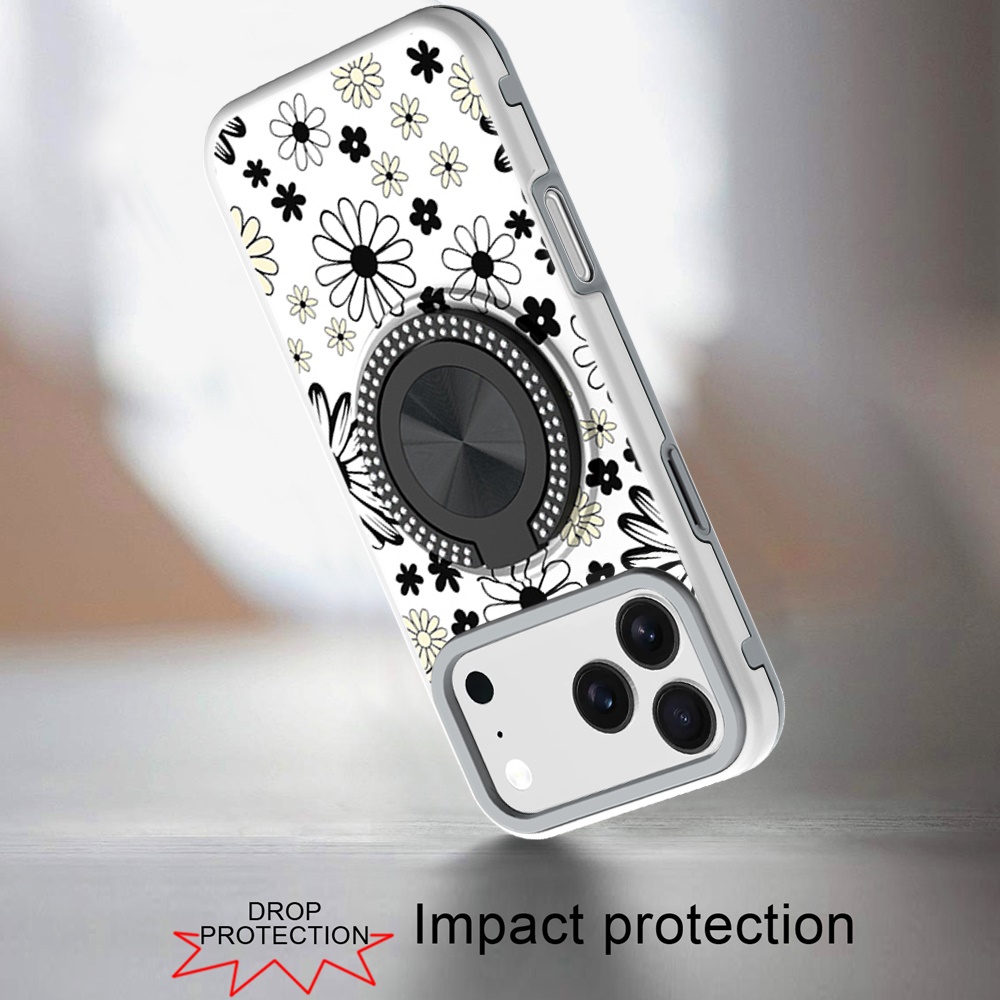 For iPhone 17 Pro Max Metal Diamond CD Pattern Design Matte Finished Hybrid with Rotational Ring [Car Mount Friendly] Case - Black & White Floral