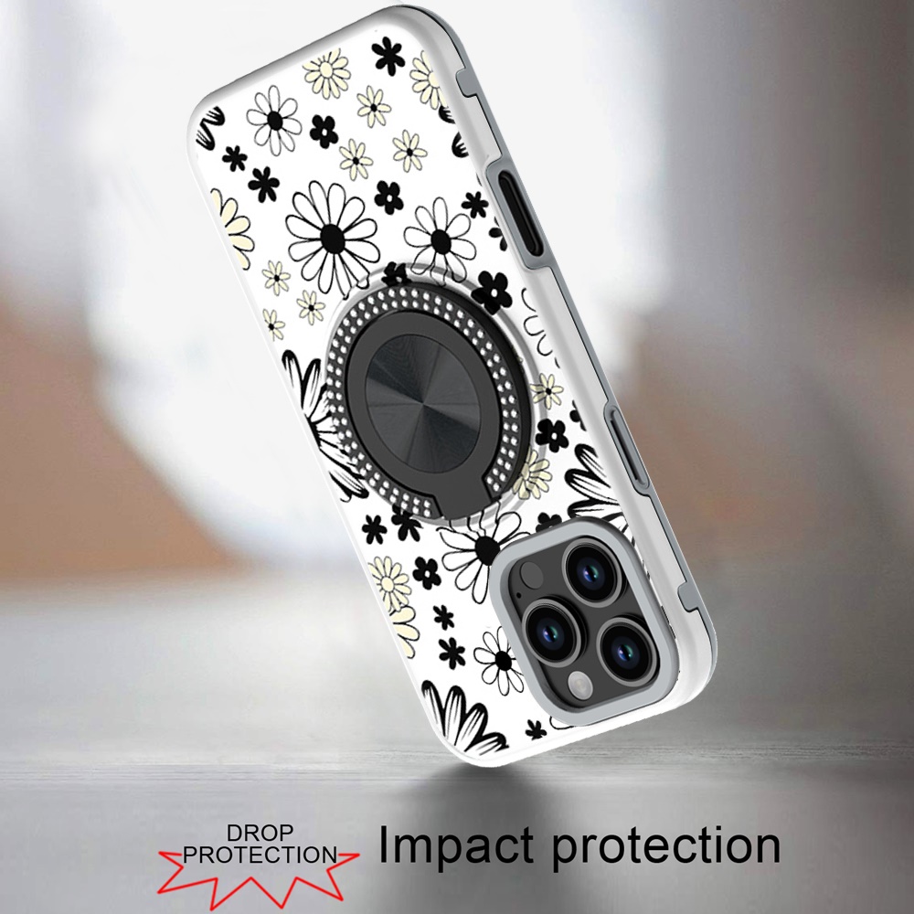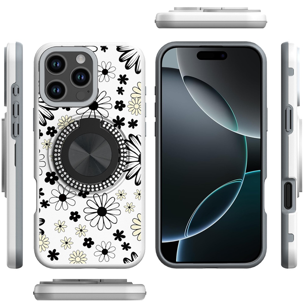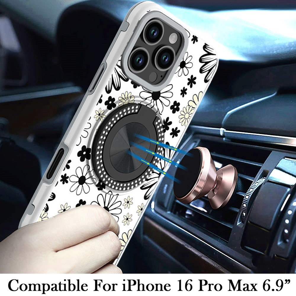 For iPhone 16 Pro Max 6.9 Metal Diamond CD Pattern Design Matte Finished Hybrid with Rotational Ring [Car Mount Friendly] Case - Black & White Floral