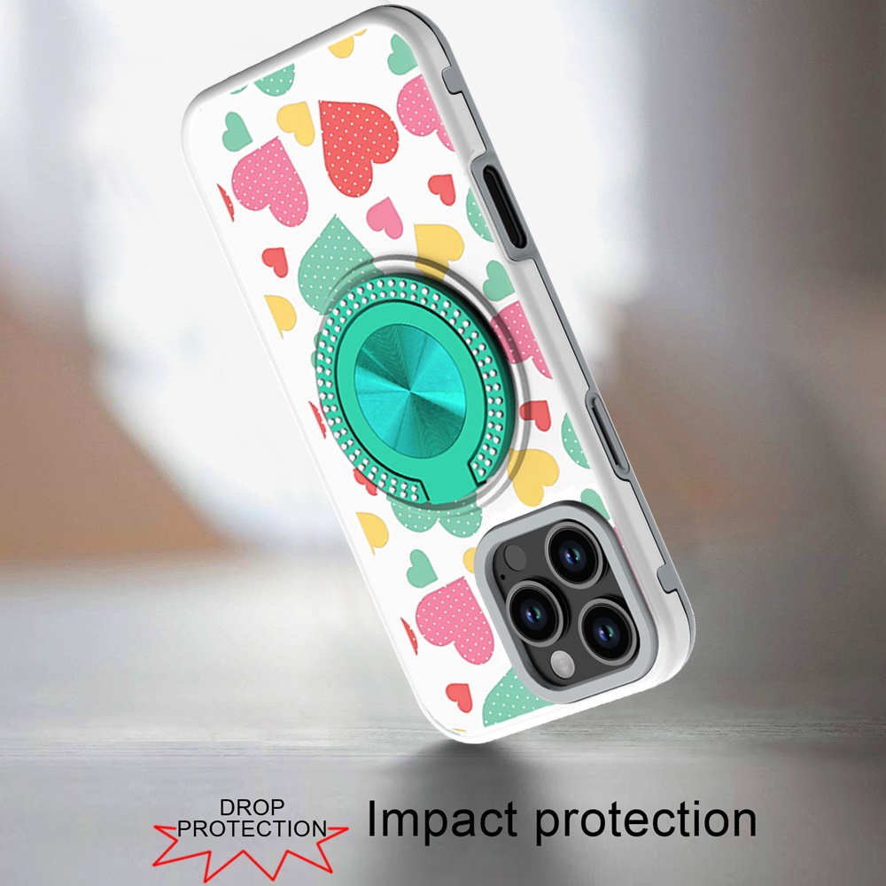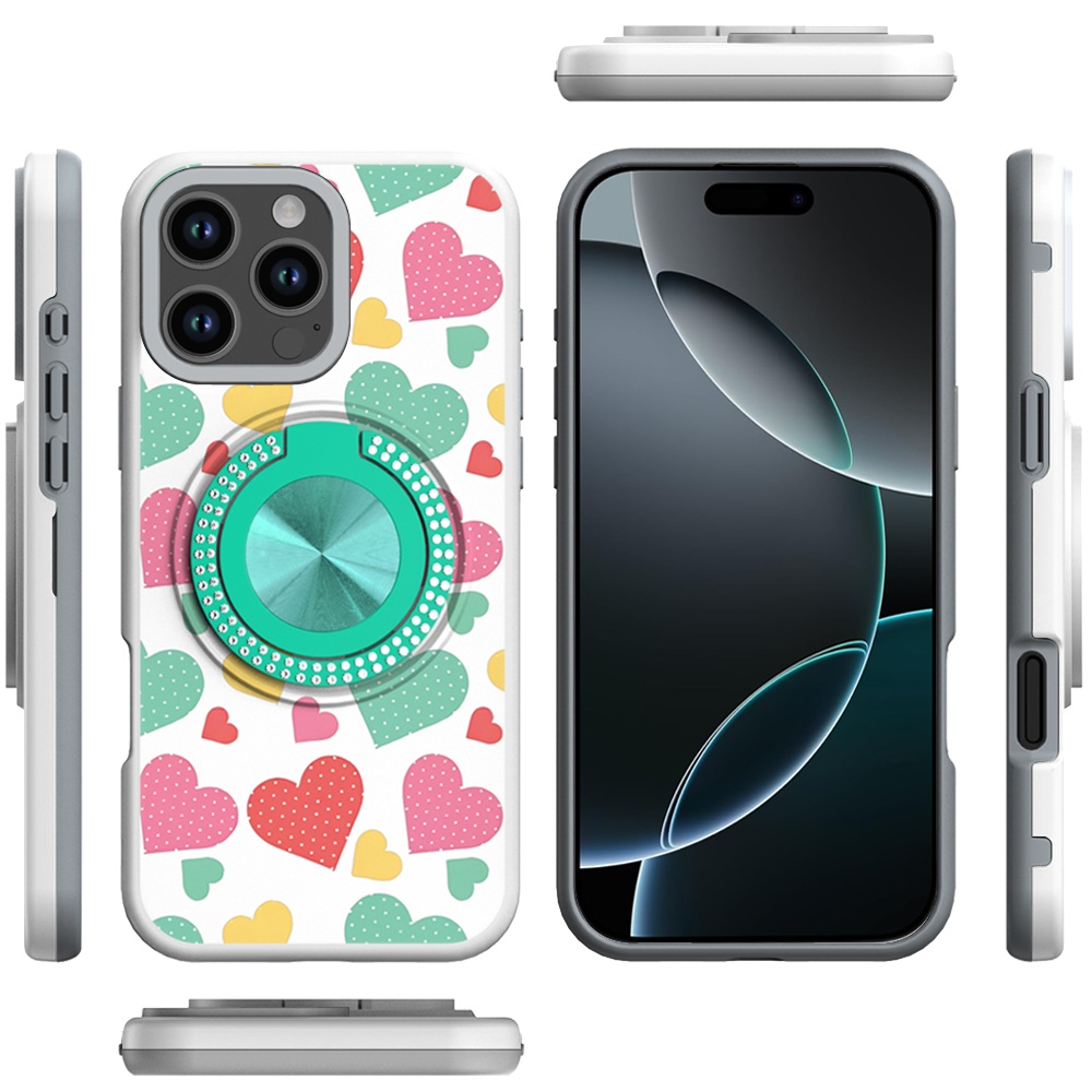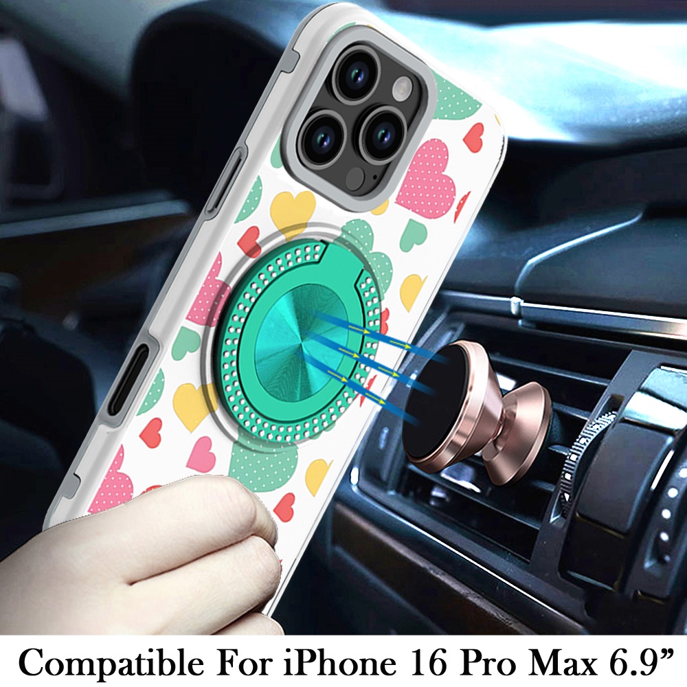 For iPhone 16 Pro Max 6.9 Metal Diamond CD Pattern Design Matte Finished Hybrid with Rotational Ring [Car Mount Friendly] Case - Pastel Hearts