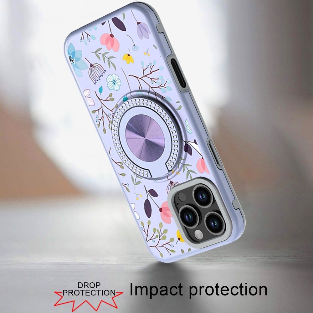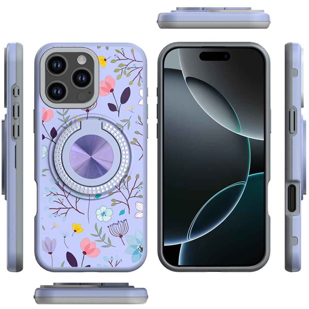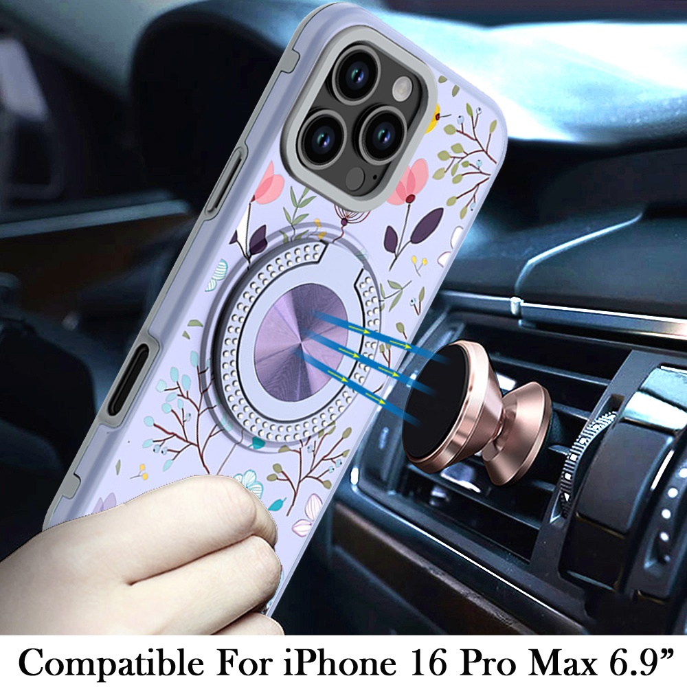 For iPhone 16 Pro Max 6.9 Metal Diamond CD Pattern Design Matte Finished Hybrid with Rotational Ring [Car Mount Friendly] Case - Lavender Floral