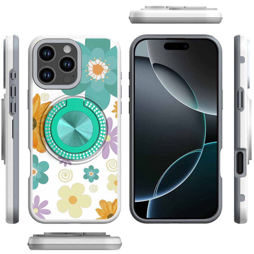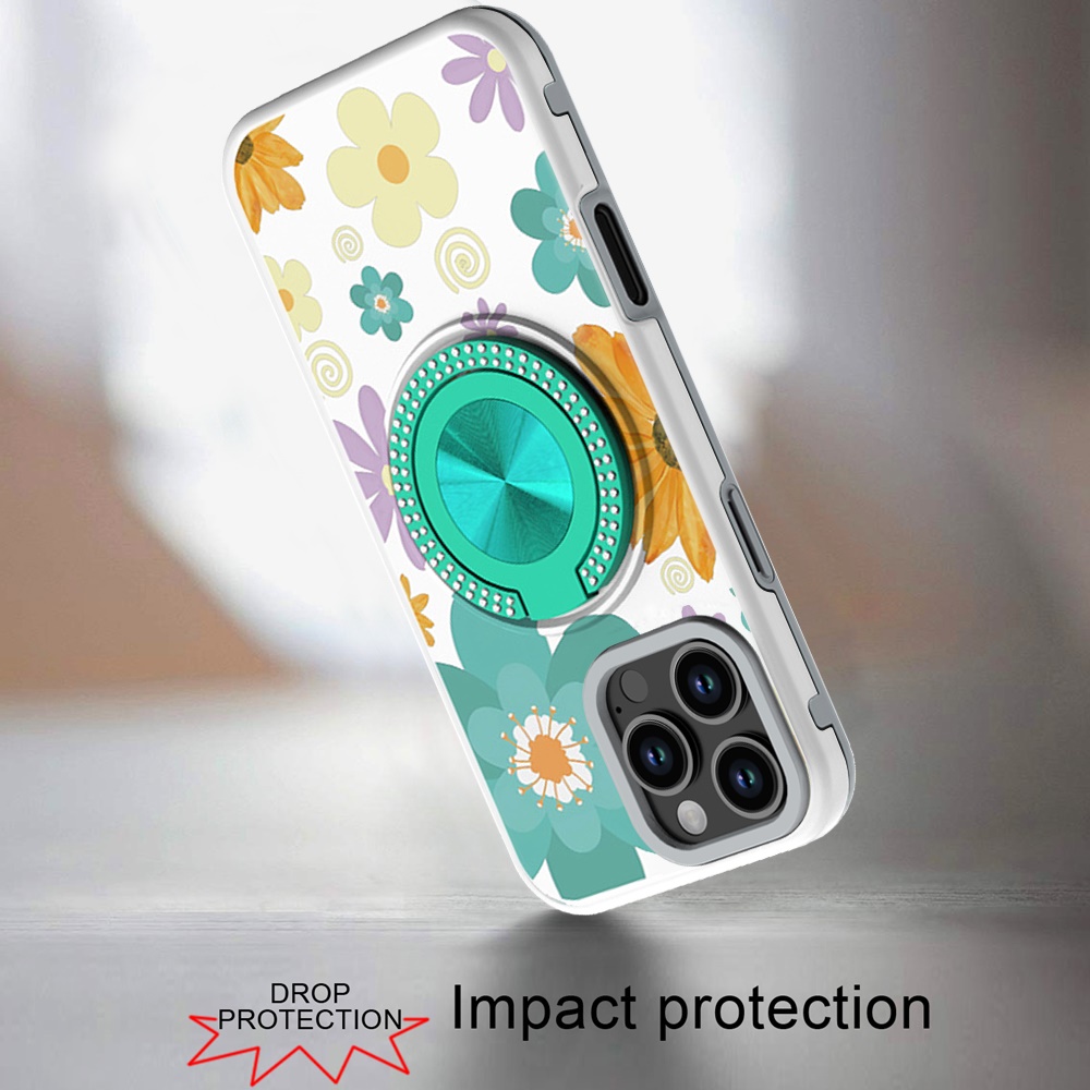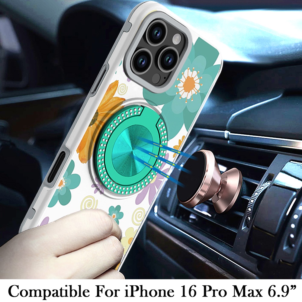 For iPhone 16 Pro Max 6.9 Metal Diamond CD Pattern Design Matte Finished Hybrid with Rotational Ring [Car Mount Friendly] Case - Yellow & Purple Flowers