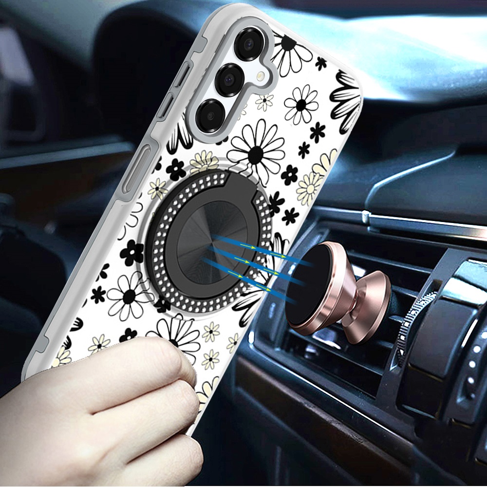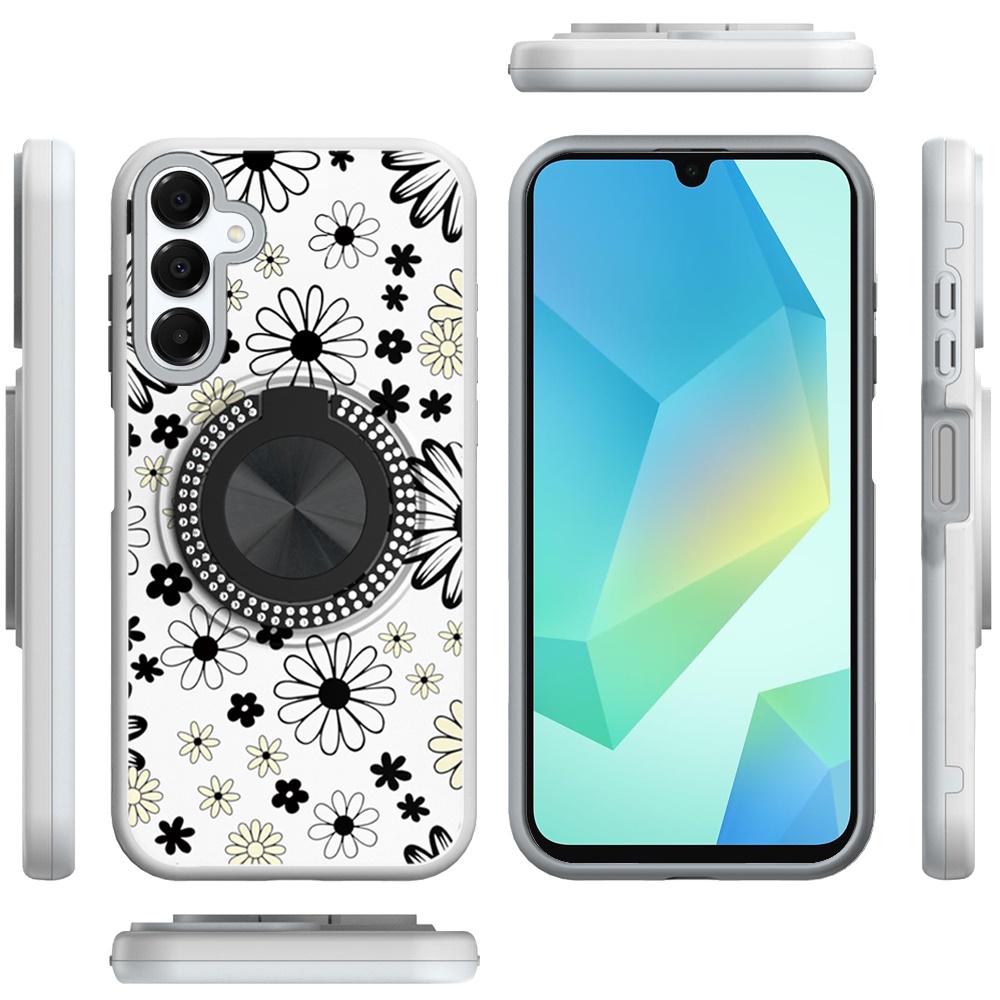 For Samsung A16 5G Metal Diamond CD Pattern Design Matte Finished Hybrid with Rotational Ring [Car Mount Friendly] Case - Black & White Floral