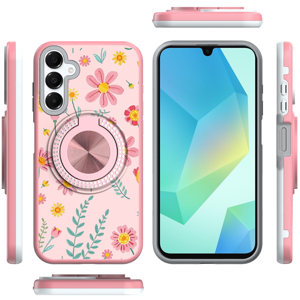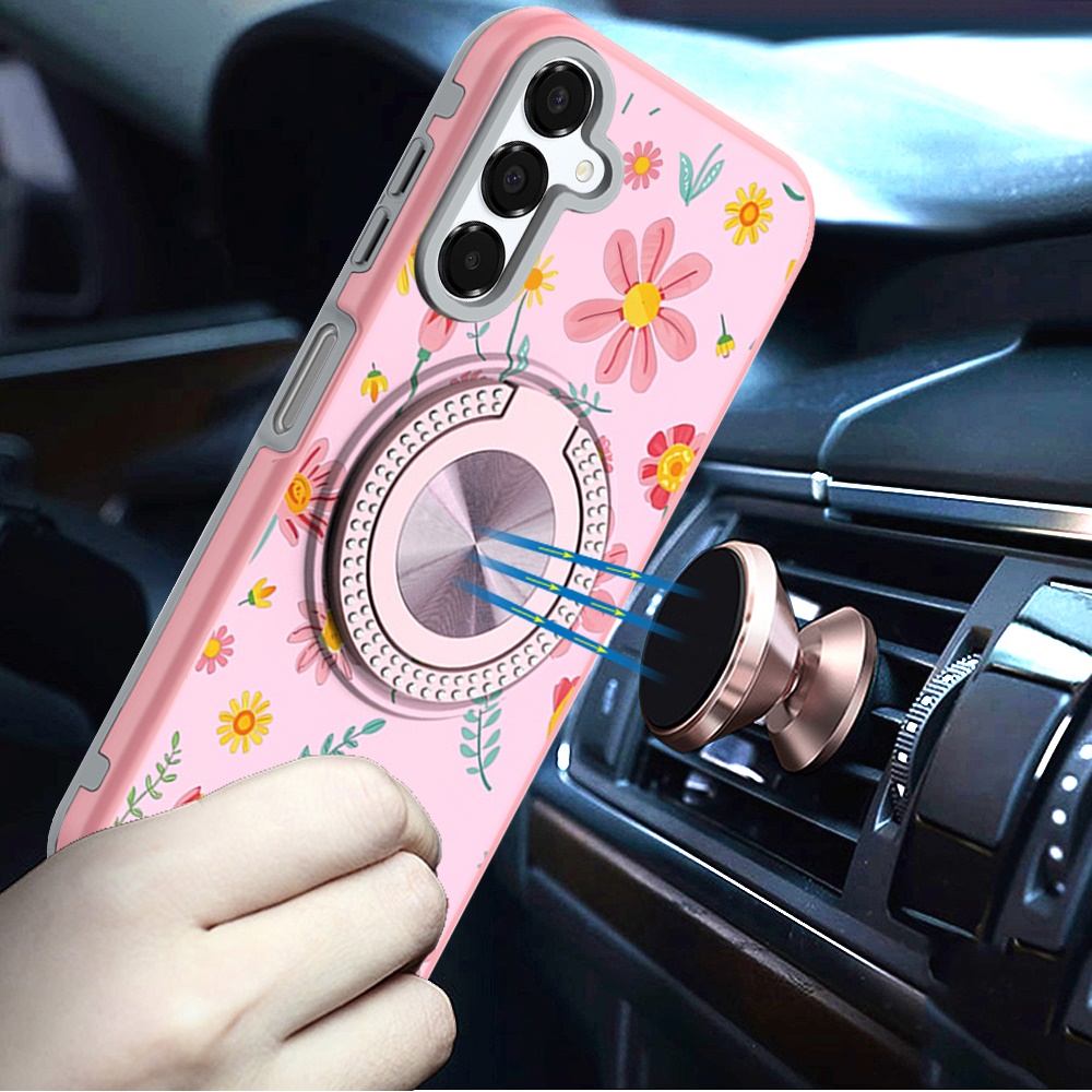 For Samsung A16 5G Metal Diamond CD Pattern Design Matte Finished Hybrid with Rotational Ring [Car Mount Friendly] Case - Pink with Daisies and Floral
