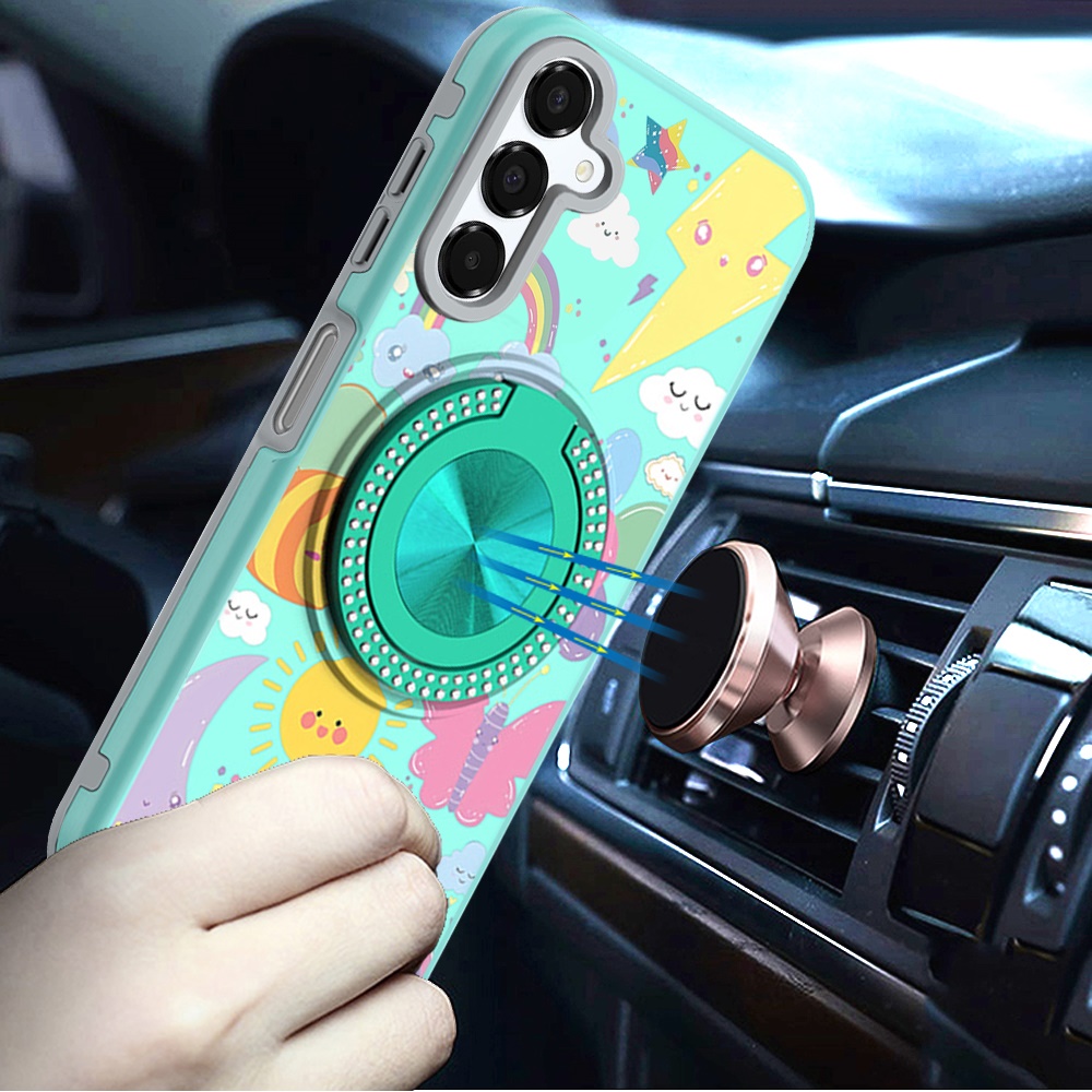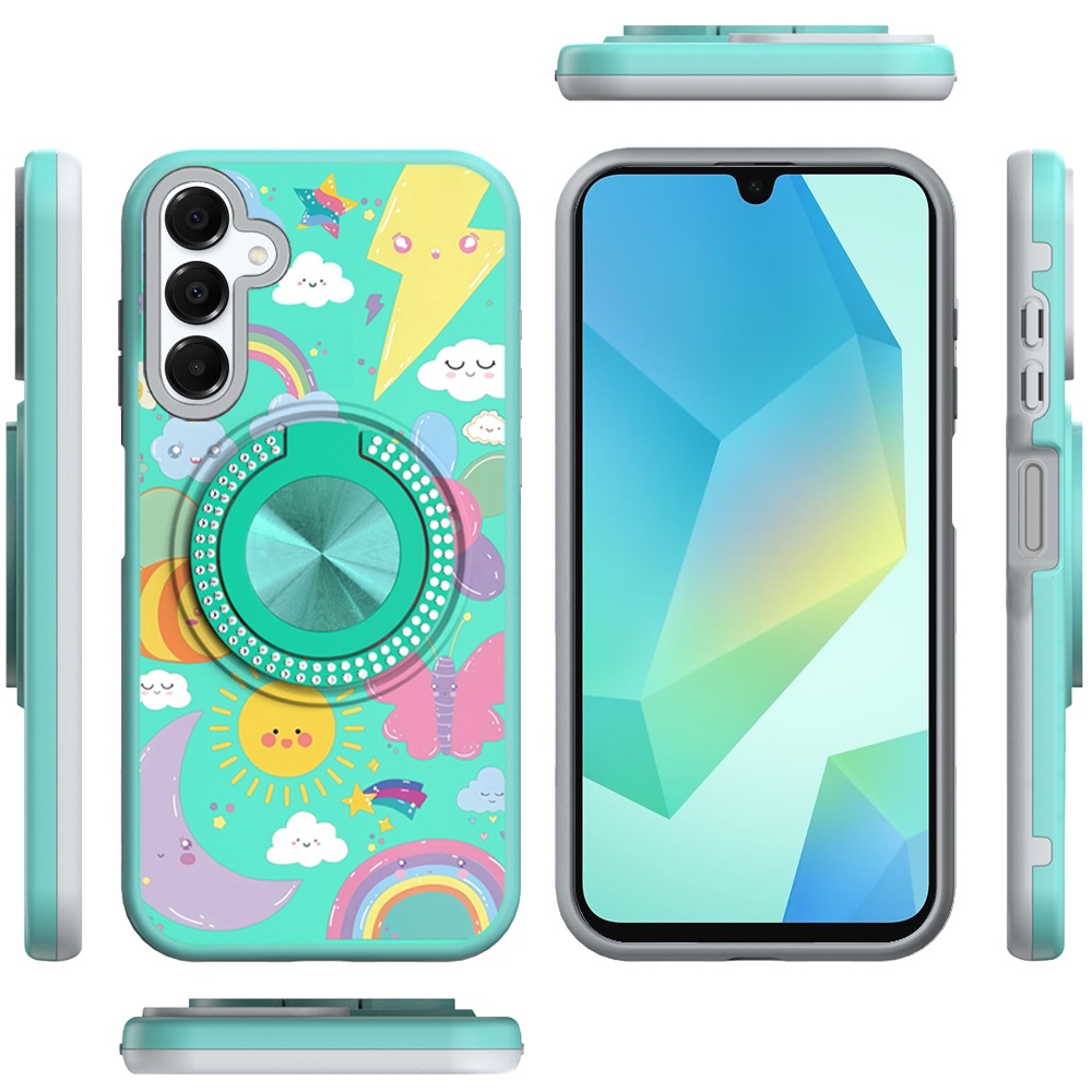 For Samsung A16 5G Metal Diamond CD Pattern Design Matte Finished Hybrid with Rotational Ring [Car Mount Friendly] Case - Aqua with Celestial Sun Rainbows