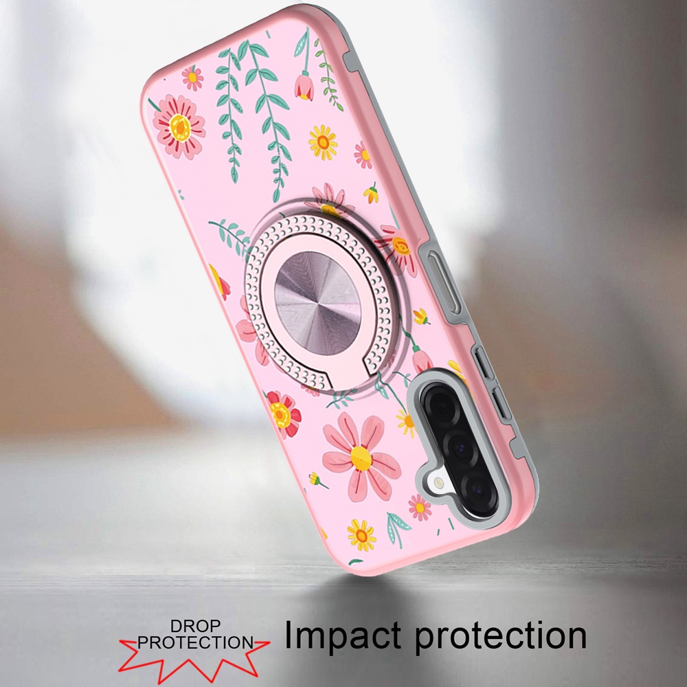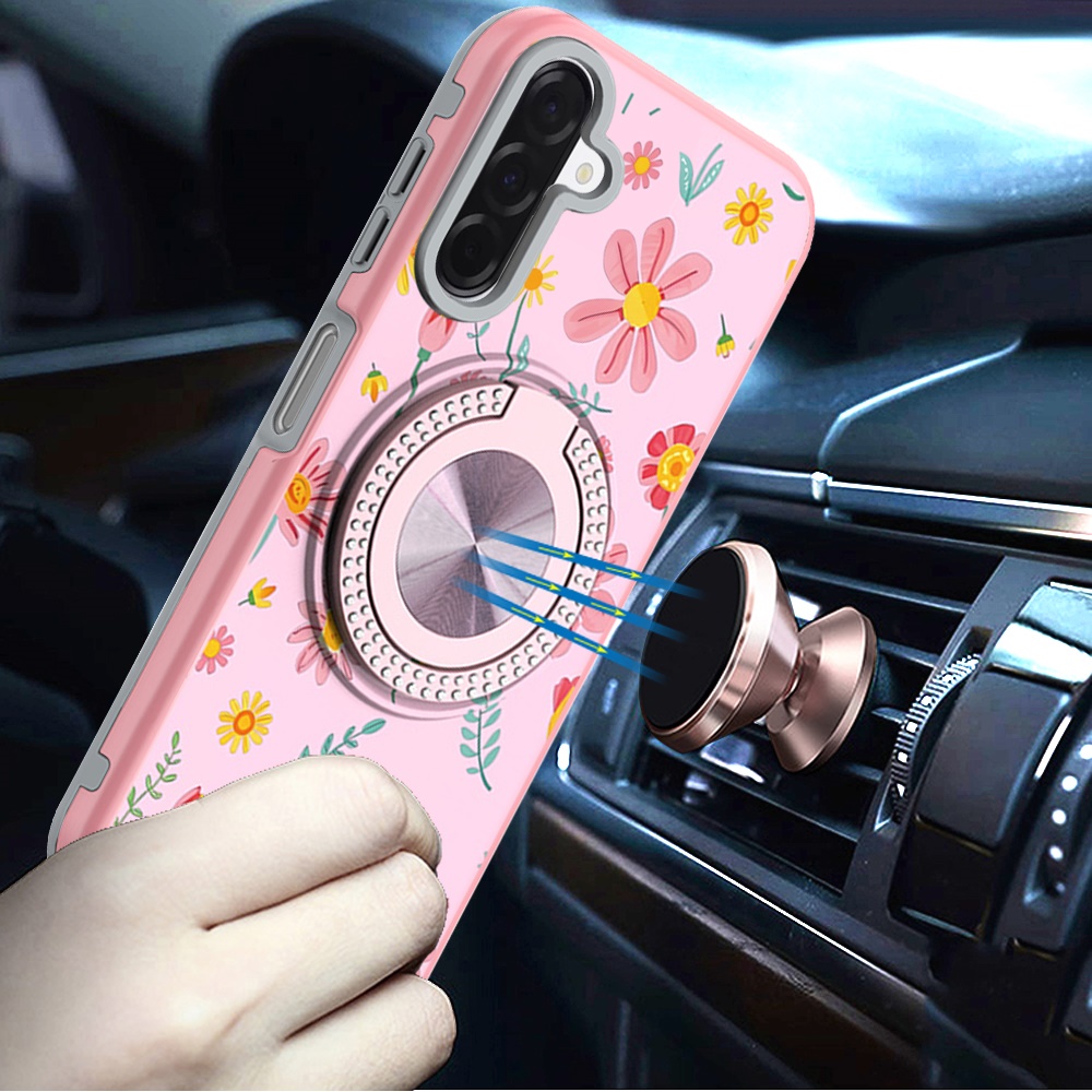 For Samsung A17 5G Metal Diamond CD Pattern Design Matte Finished Hybrid with Rotational Ring [Car Mount Friendly] Case - Pink with Daisies and Floral