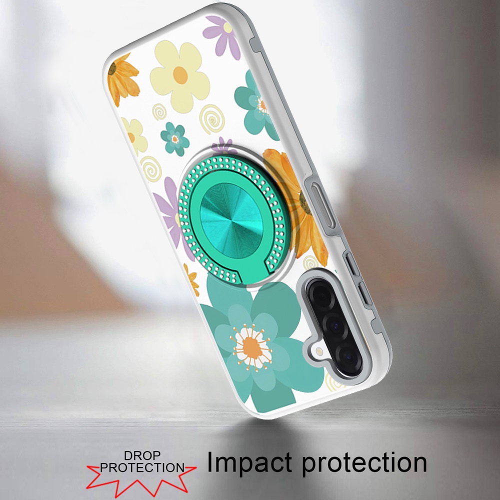 For Samsung A17 5G Metal Diamond CD Pattern Design Matte Finished Hybrid with Rotational Ring [Car Mount Friendly] Case - Yellow & Purple Flowers