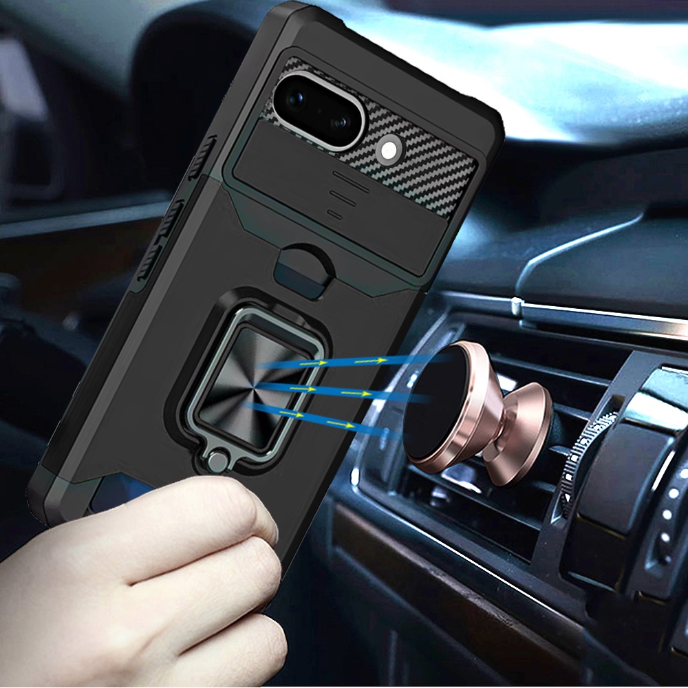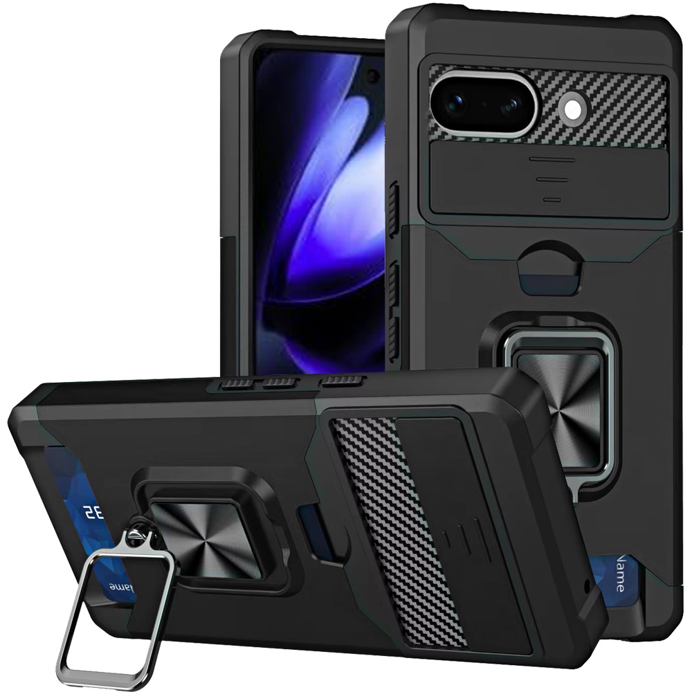 For Google Pixel 9A Multi-Functional Card Magnetic Ring Stand Hybrid Camera Case Cover - Black