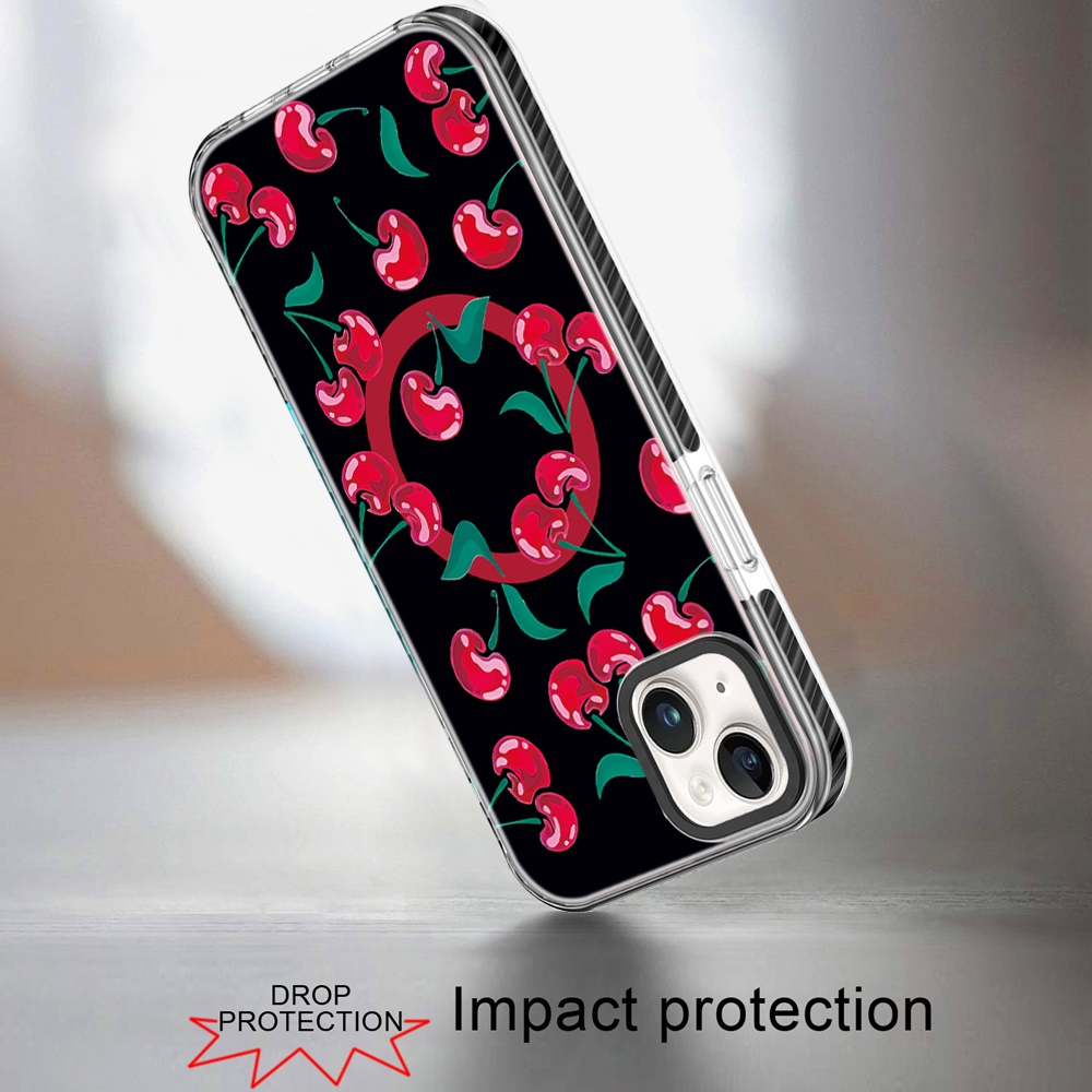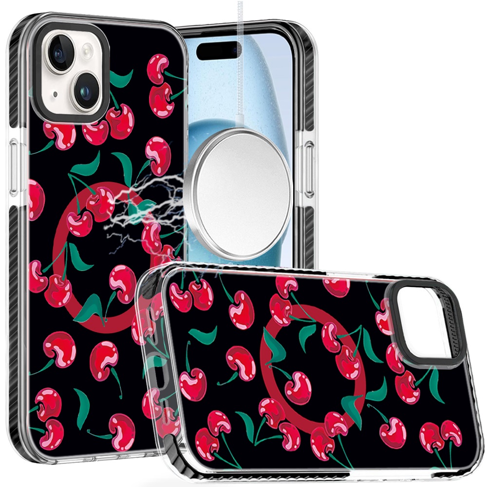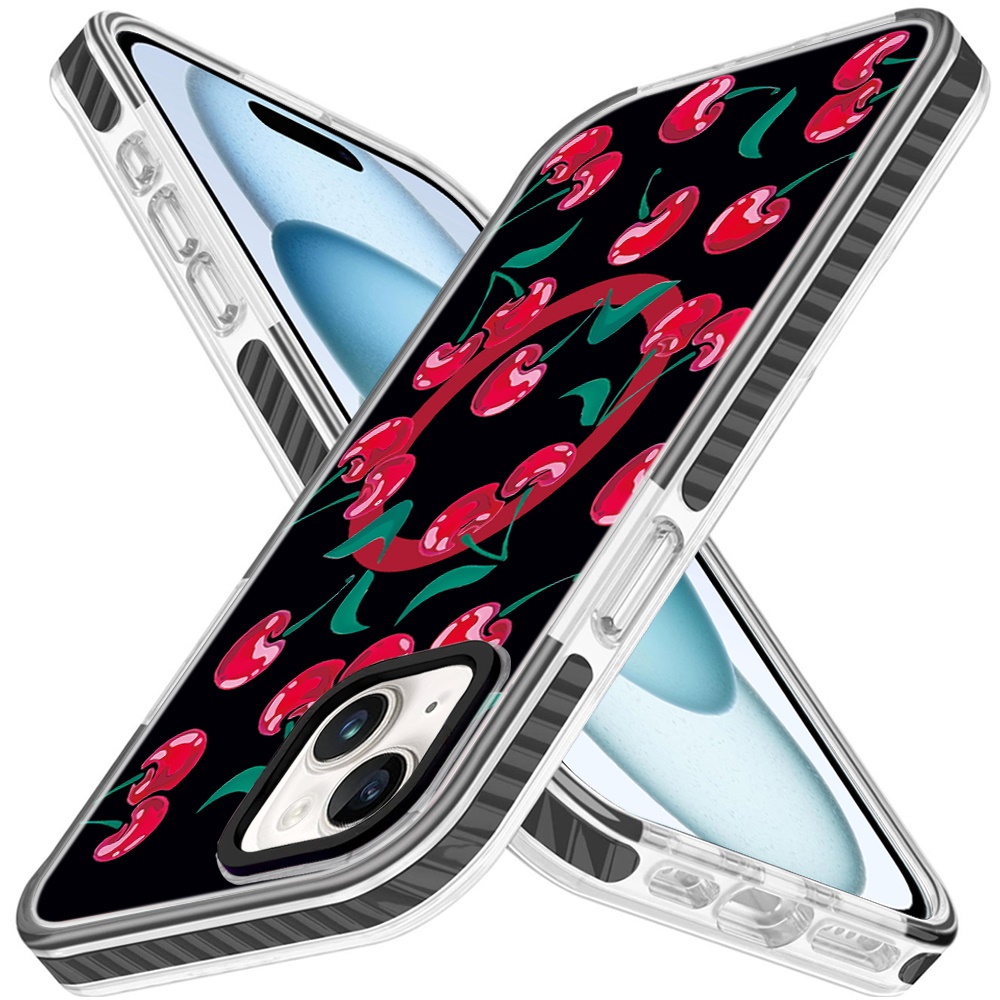 For iPhone 15 Beautiful Magnetic Hybrid IMD Design Case - Black Base with Red Cherries