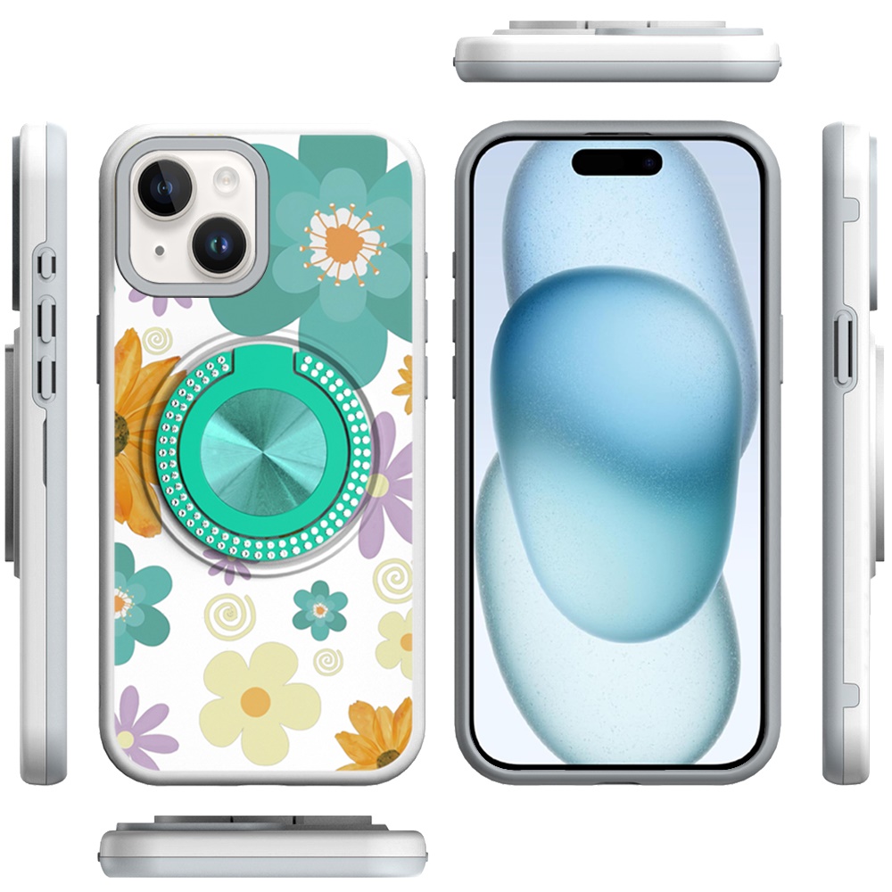 For iPhone 15 Metal Diamond CD Pattern Design Matte Finished Hybrid with Rotational Ring [Car Mount Friendly] Case - Yellow & Purple Flowers