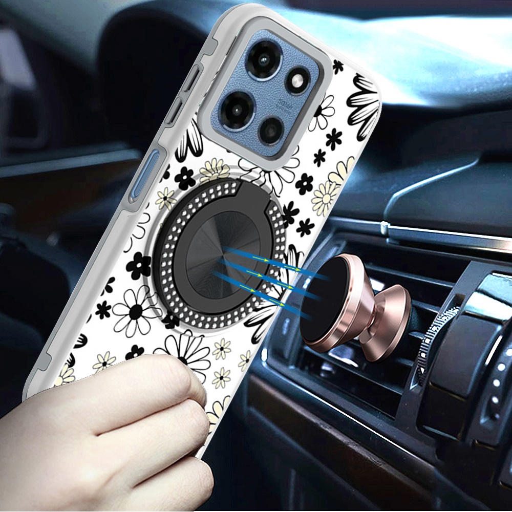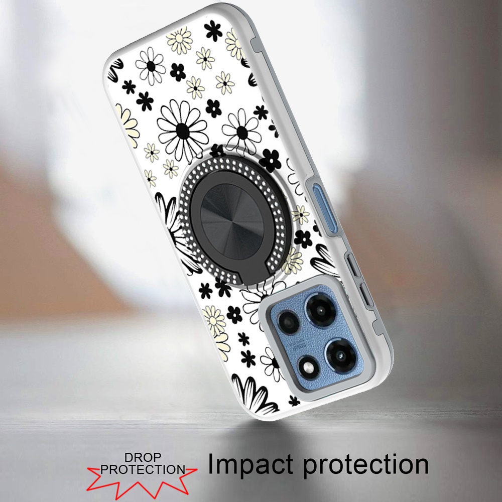 For Motorola Moto G 5G 2025 Metal Diamond CD Pattern Design Matte Finished Hybrid with Rotational Ring [Car Mount Friendly] Case - Black & White Floral