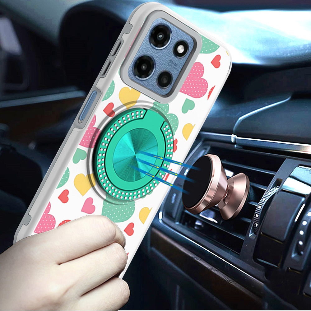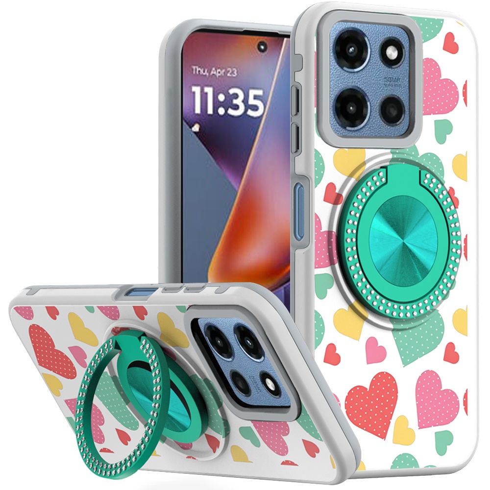 For Motorola Moto G 5G 2025 Metal Diamond CD Pattern Design Matte Finished Hybrid with Rotational Ring [Car Mount Friendly] Case - Pastel Hearts