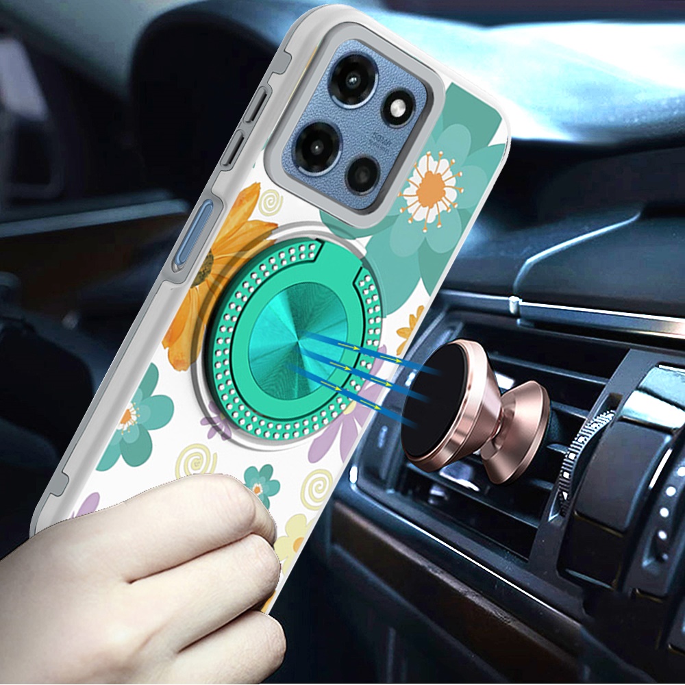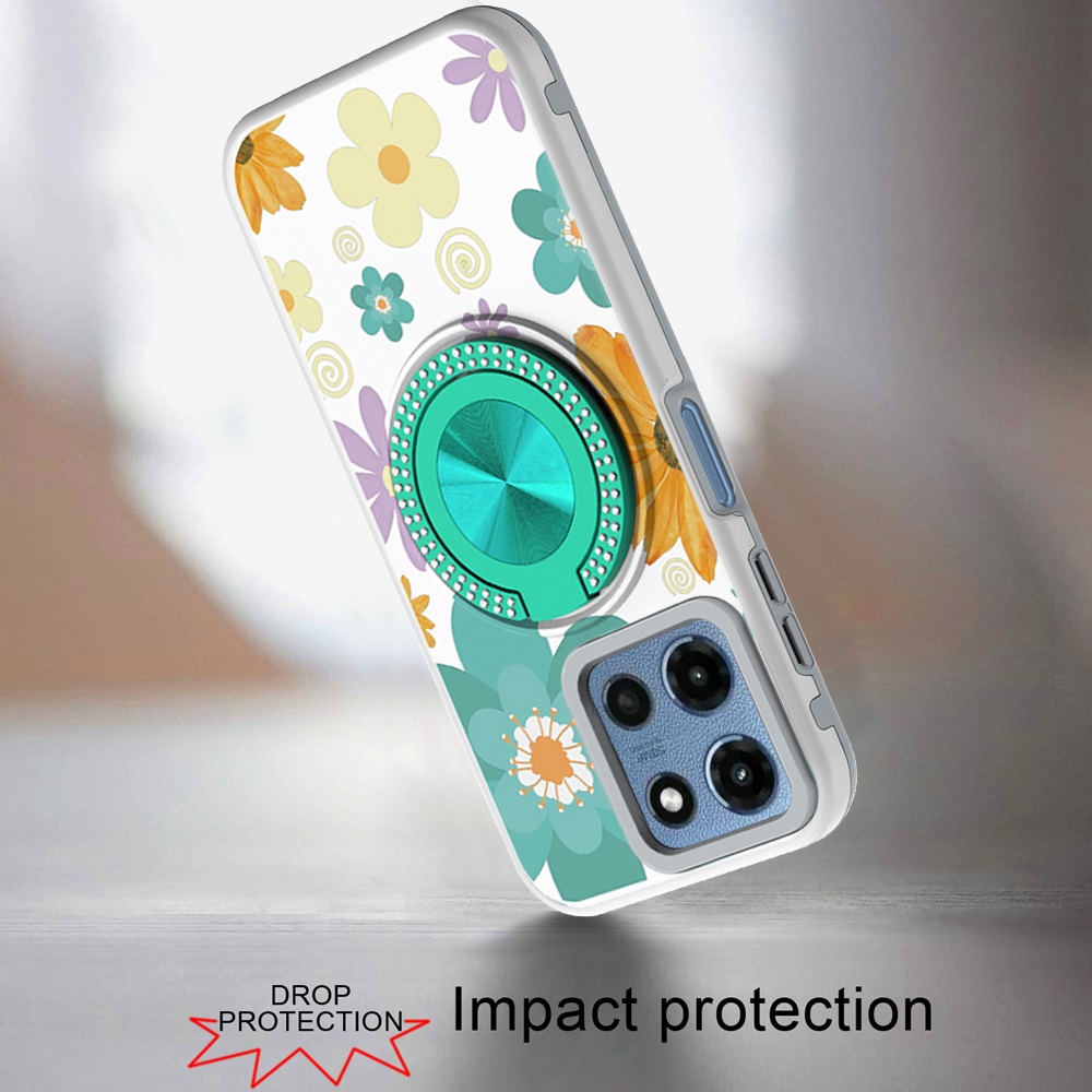 For Motorola Moto G 5G 2025 Metal Diamond CD Pattern Design Matte Finished Hybrid with Rotational Ring [Car Mount Friendly] Case - Yellow & Purple Flowers