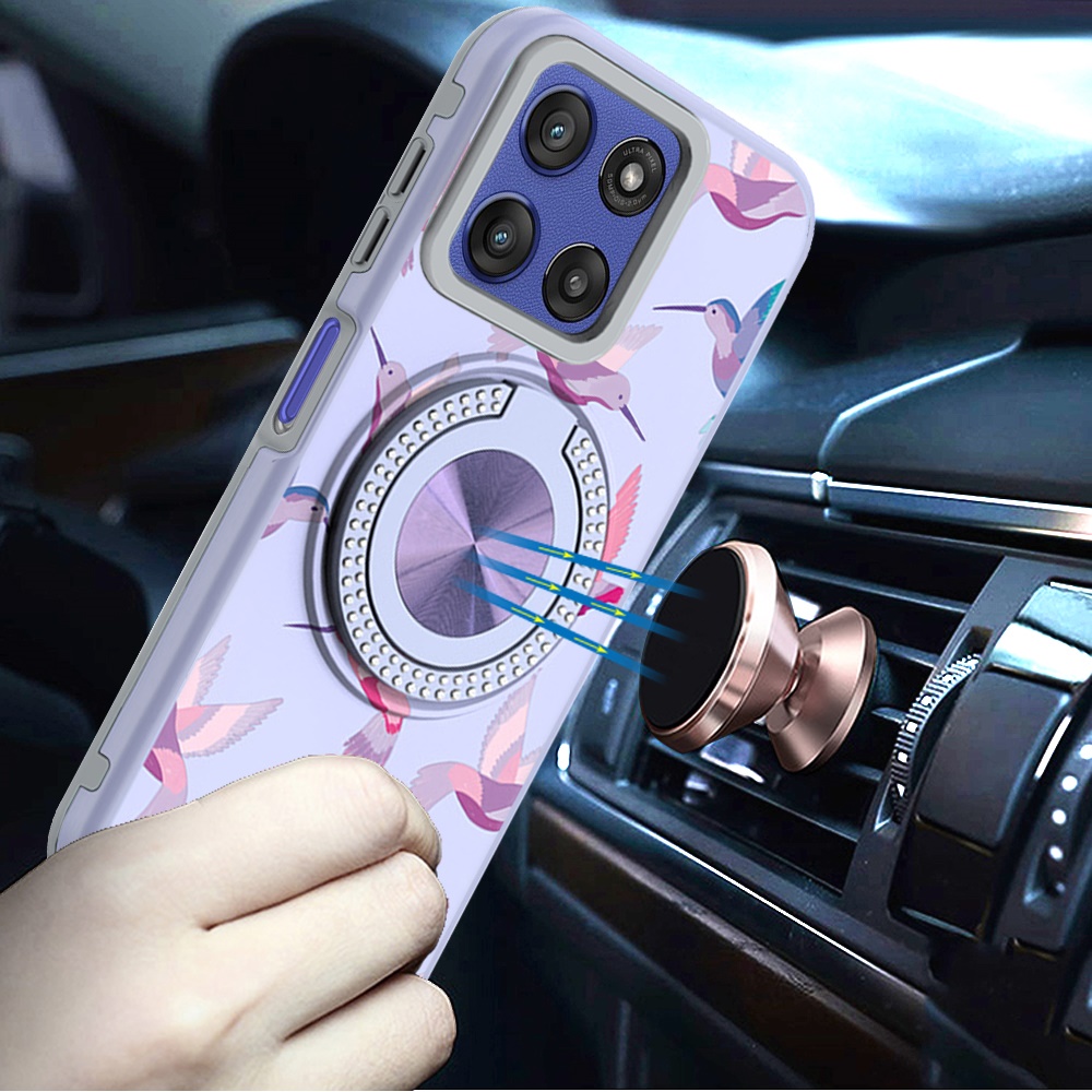 For Moto G Stylus 5G 2025 Metal Diamond CD Pattern Design Matte Finished Hybrid with Rotational Ring [Car Mount Friendly] Case - Hummingbird & Floral
