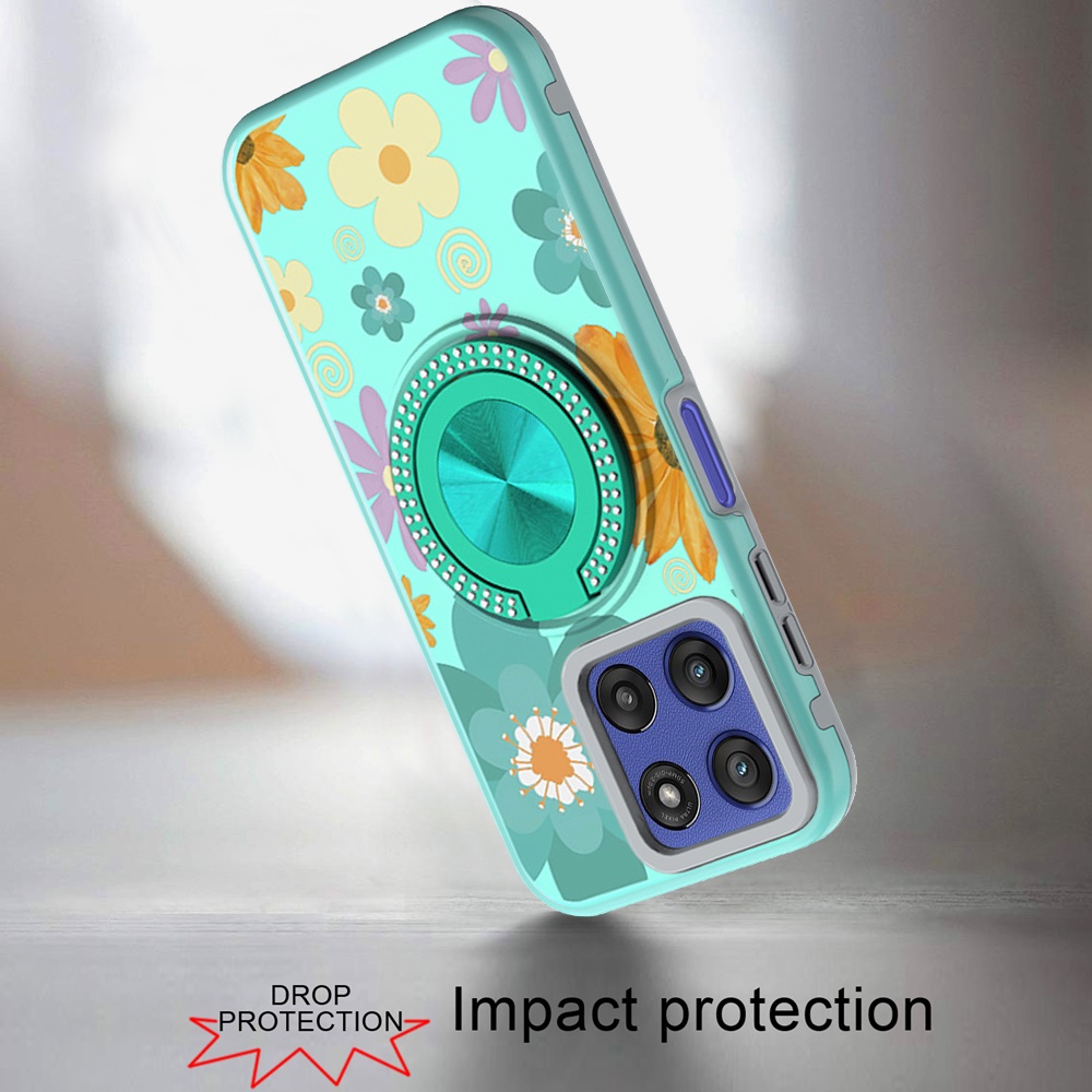 For Moto G Stylus 5G 2025 Metal Diamond CD Pattern Design Matte Finished Hybrid with Rotational Ring [Car Mount Friendly] Case - Aqua Floral & Leaves
