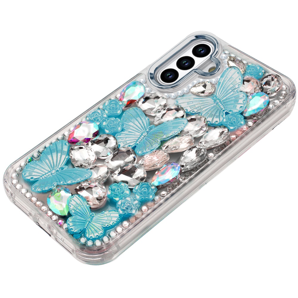 For Samsung s25 FE Lavished Floral Butterfly Bling Stones Hybrid Case - Blue