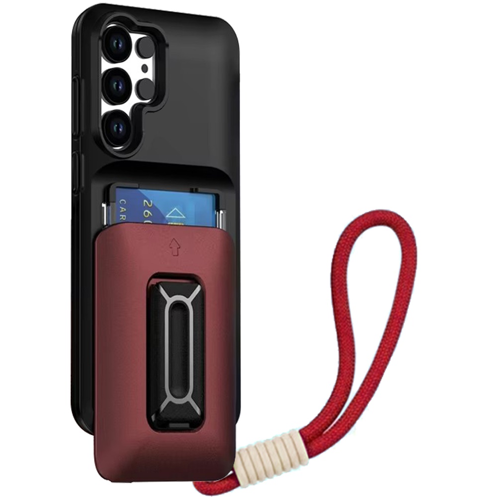 For Samsung s25 Ultra Card Holder (2X) with Wrist Strap Hybrid With KickStand - Black+Red