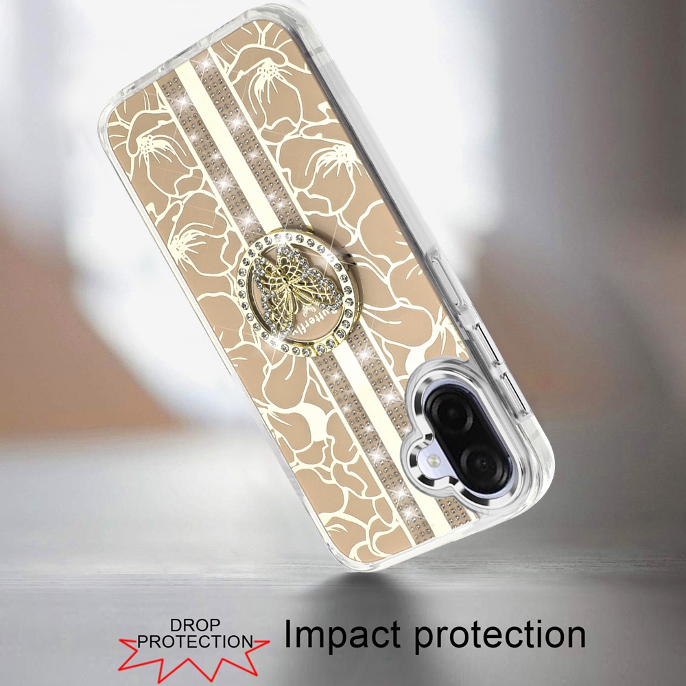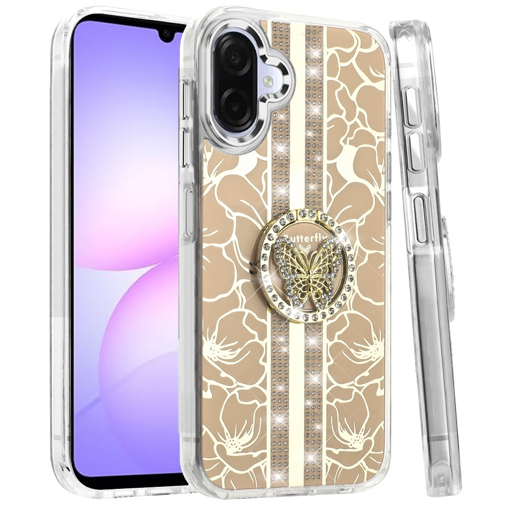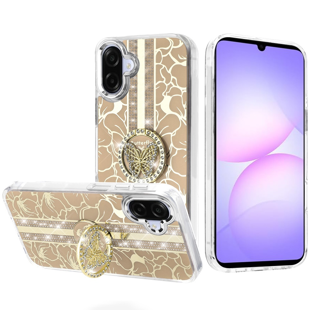 For Samsung Galaxy A07 Splendid Floral Designs with Metal Camera and Buttons with Butterfly Ring Stand Hybrid Case - Gold