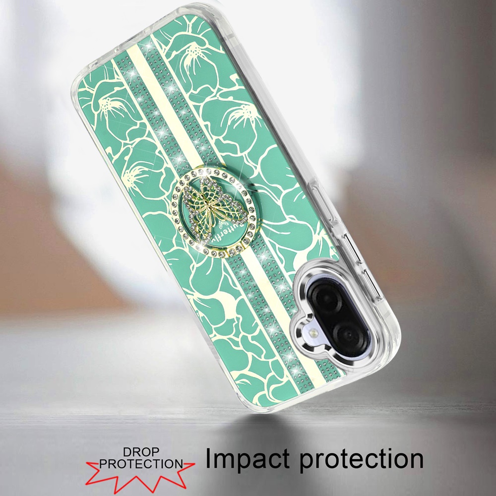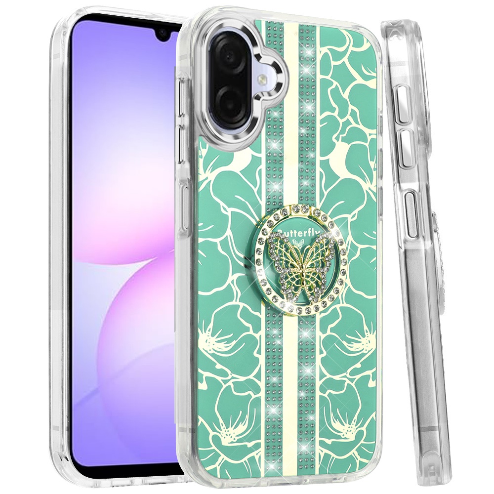 For Samsung Galaxy A07 Splendid Floral Designs with Metal Camera and Buttons with Butterfly Ring Stand Hybrid Case - Light Green