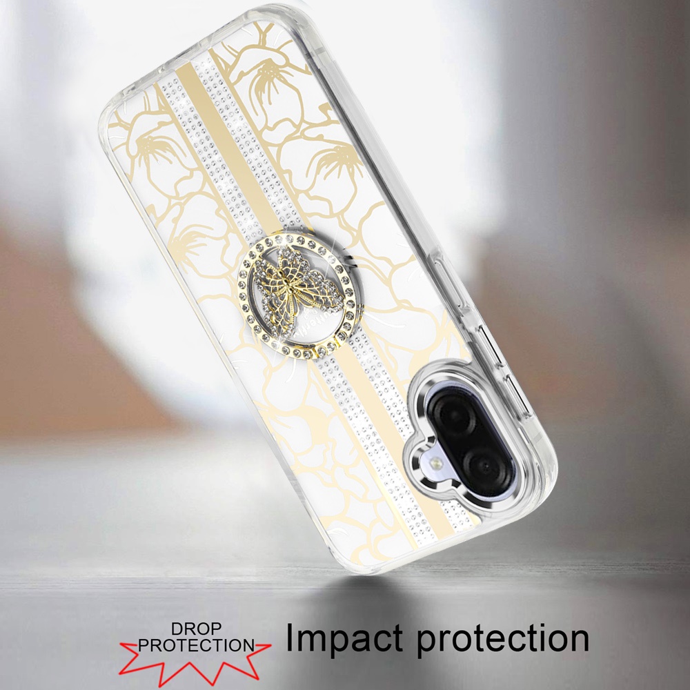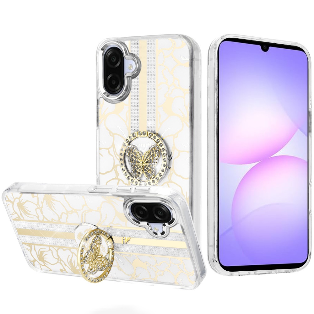 For Samsung Galaxy A07 Splendid Floral Designs with Metal Camera and Buttons with Butterfly Ring Stand Hybrid Case - White