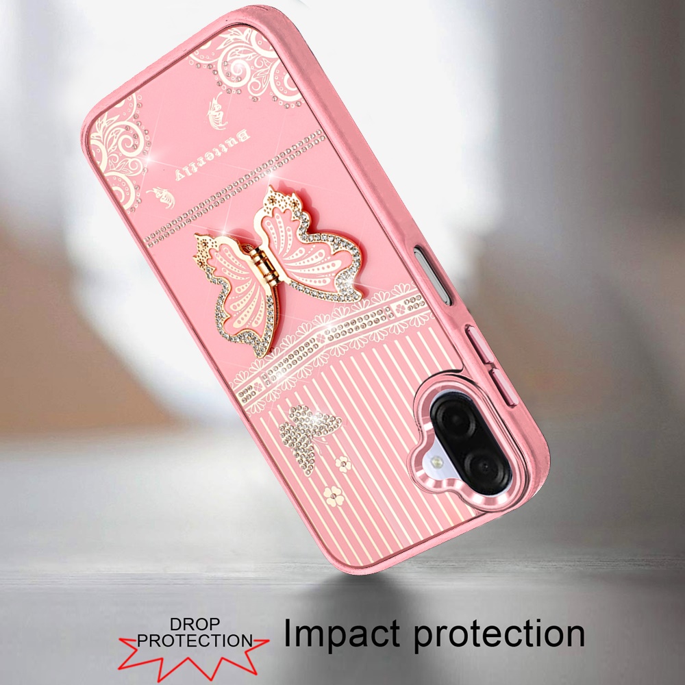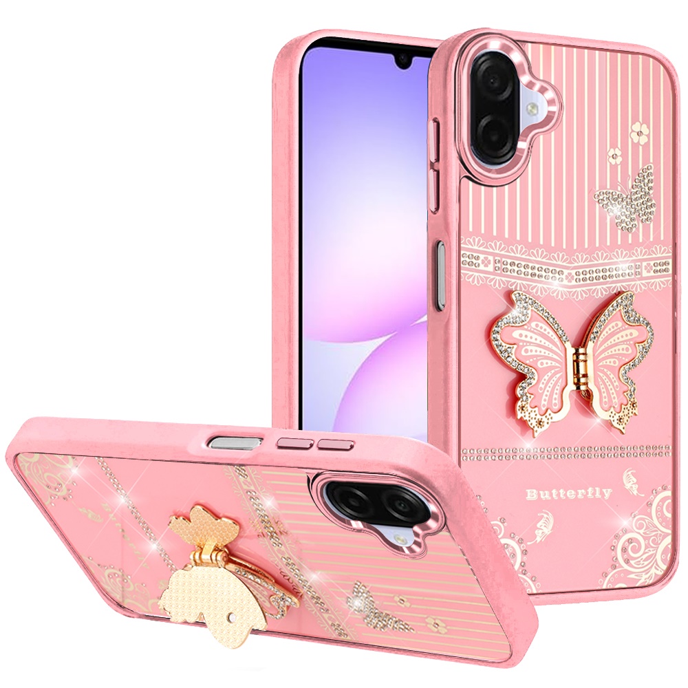 For Samsung Galaxy A07 Splendid Glitter Butterfly Design Stand with Metallic Edges Hybrid Case - Light Pink