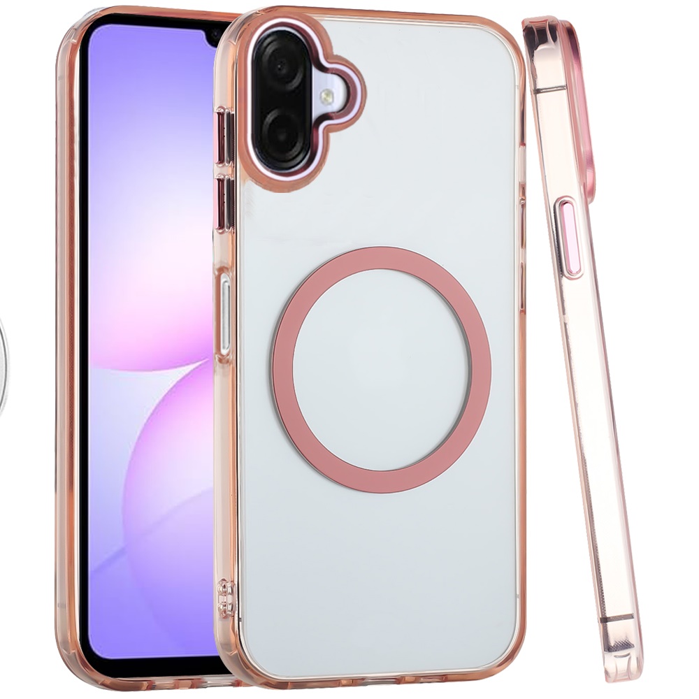 For Samsung Galaxy A07 Magnetic Circle Ring Transparent Premium Acrylic with Metal Buttons & Camera Raised Lip - Rose Gold