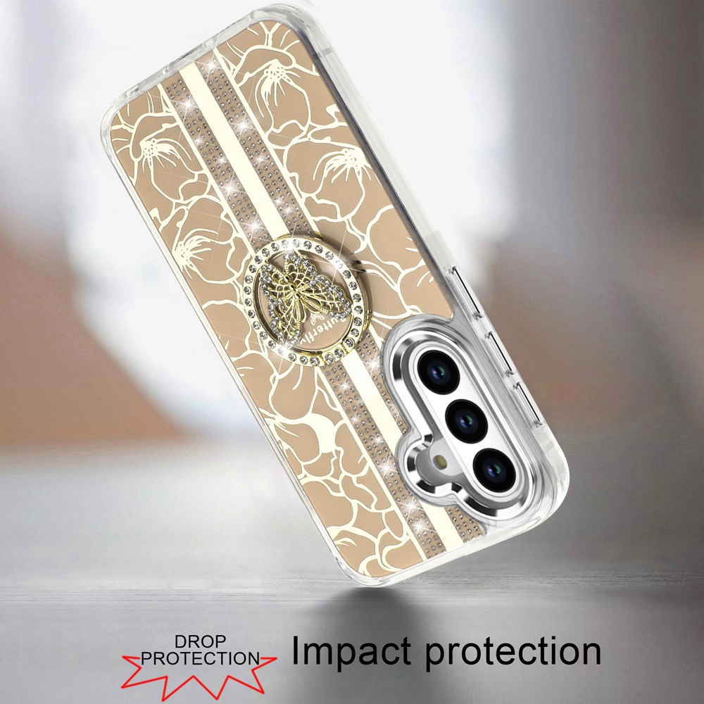 For Samsung s25 FE Splendid Floral Designs with Metal Camera and Buttons with Butterfly Ring Stand Hybrid Case - Gold
