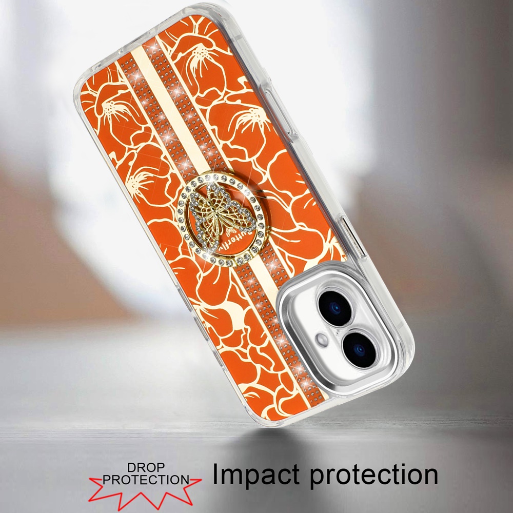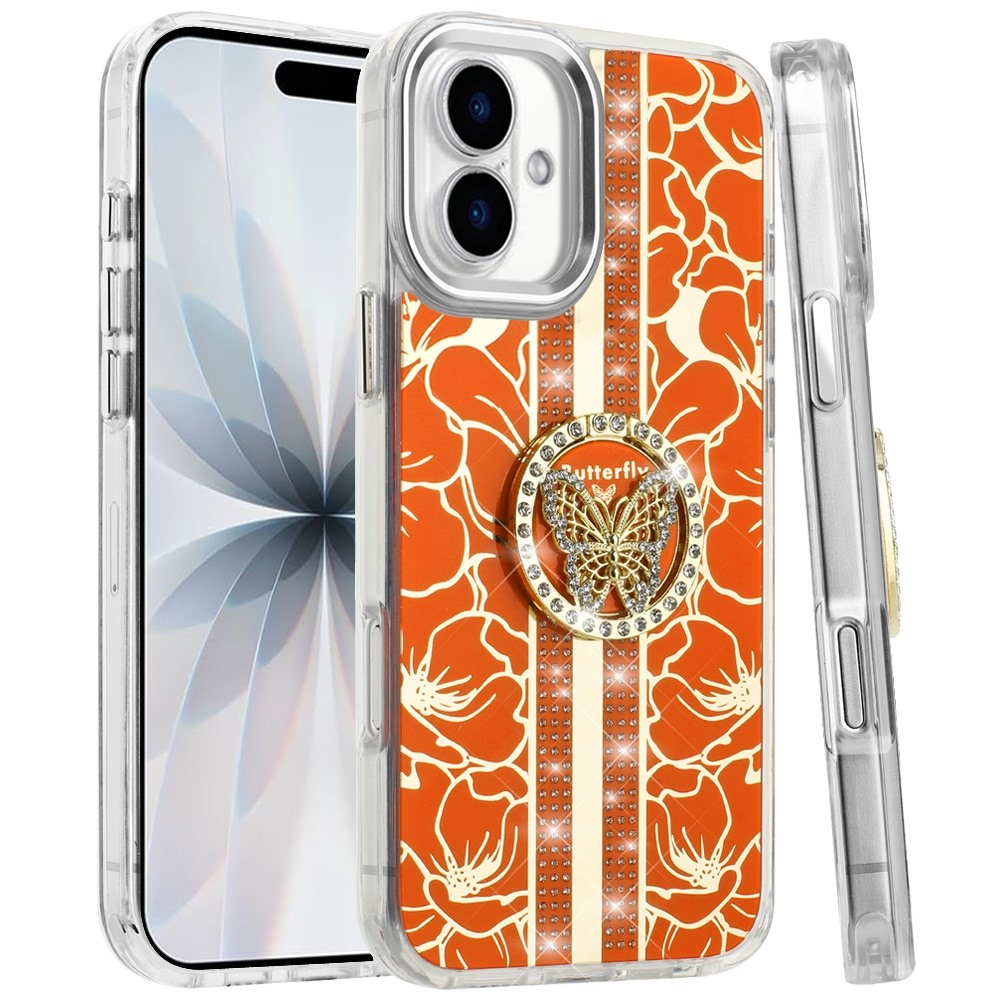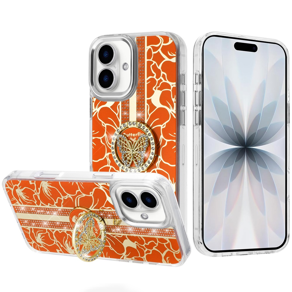 For iPhone 17 Splendid Floral Designs with Metal Camera and Buttons with Butterfly Ring Stand Hybrid Case - Cosmic Orange