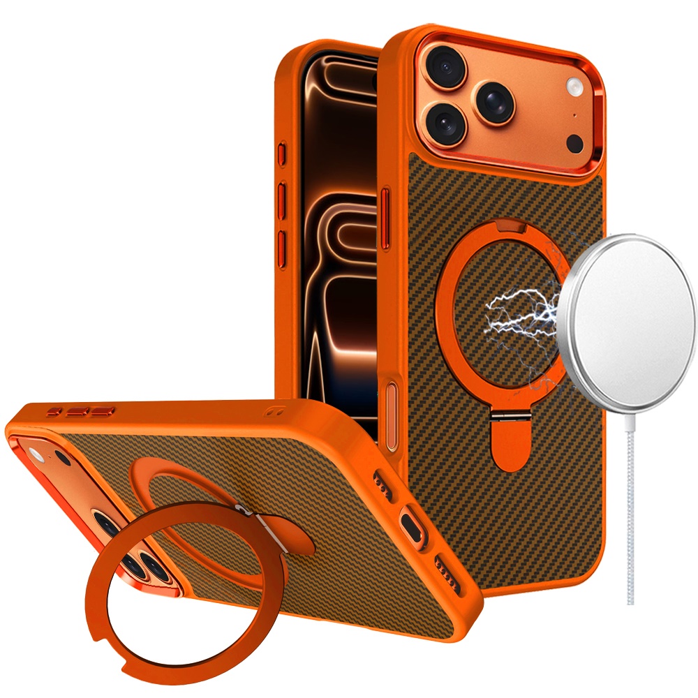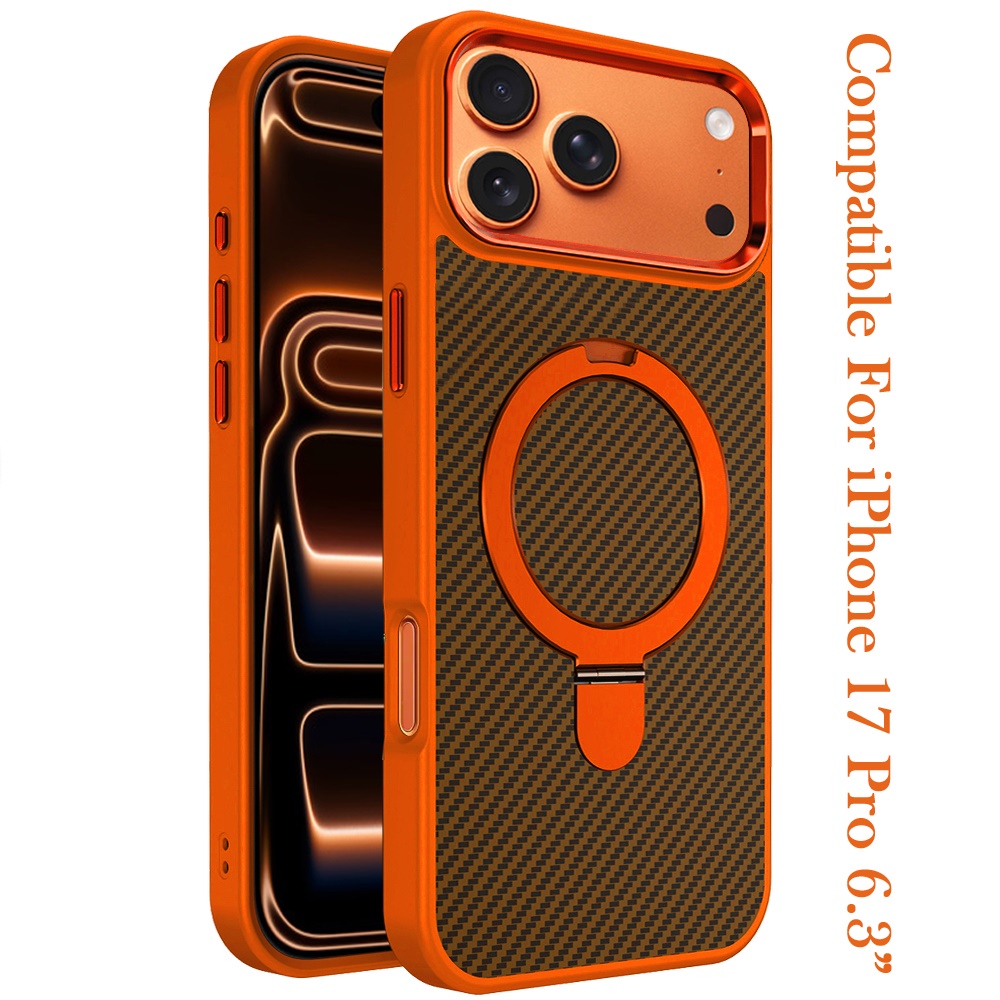 For iPhone 17 Pro Carbon Design [Magnetic Circle] with Ring Stand Hybrid Case - Cosmic Orange