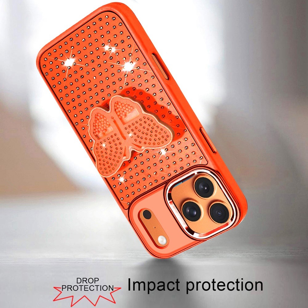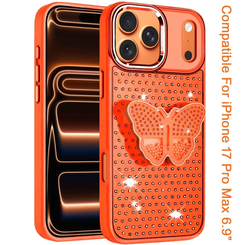 For iPhone 17 Pro Max Butterfly Moveable Grip Stand With Small Diamonds Meta Buttons HQ Hybrid - Cosmic Orange