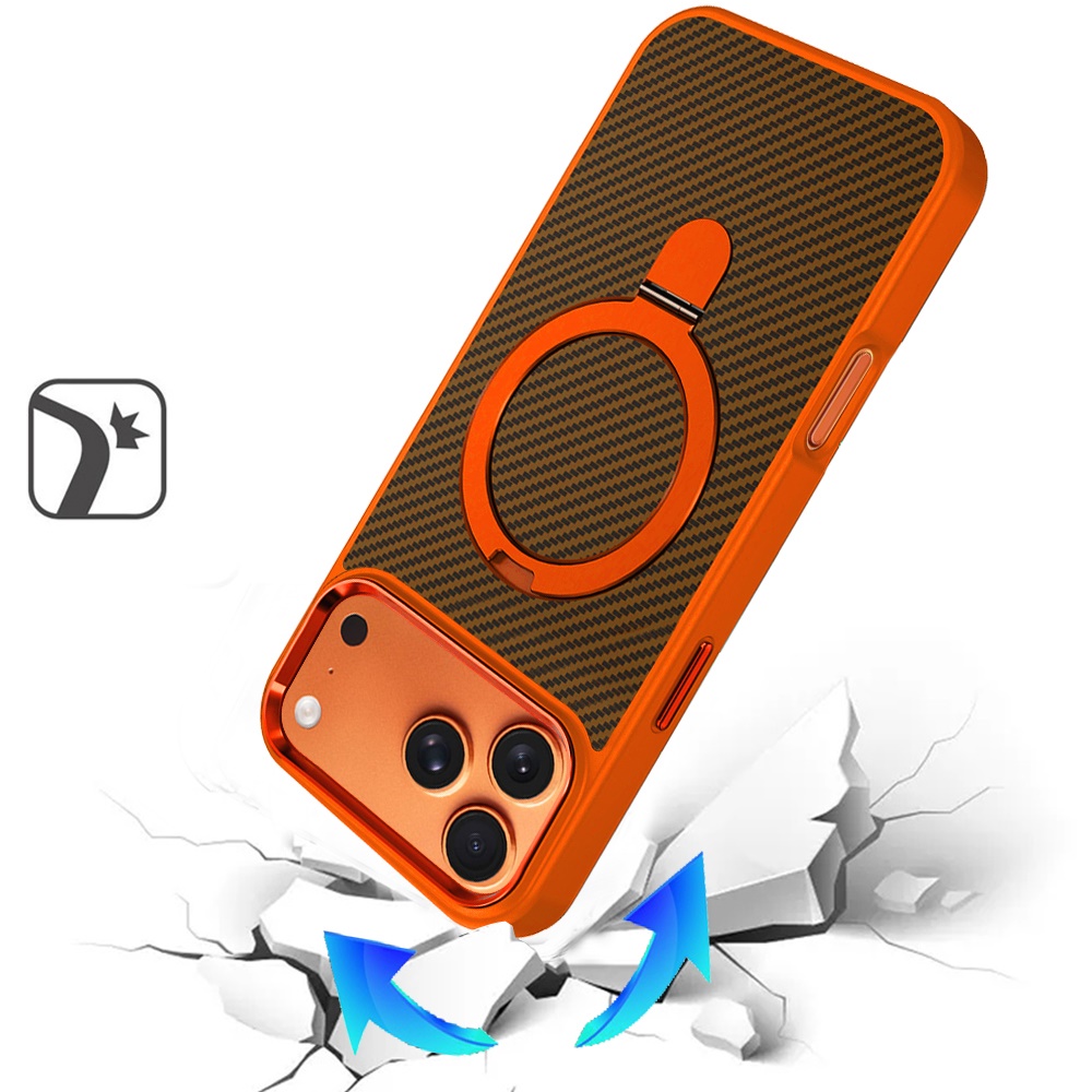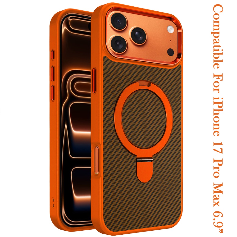 For iPhone 17 Pro Max Carbon Design [Magnetic Circle] with Ring Stand Hybrid Case - Cosmic Orange