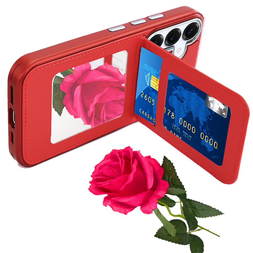 For Samsung s26 Edge Card Holder with Mirror Inside PU Leather Hybrid Case - Red