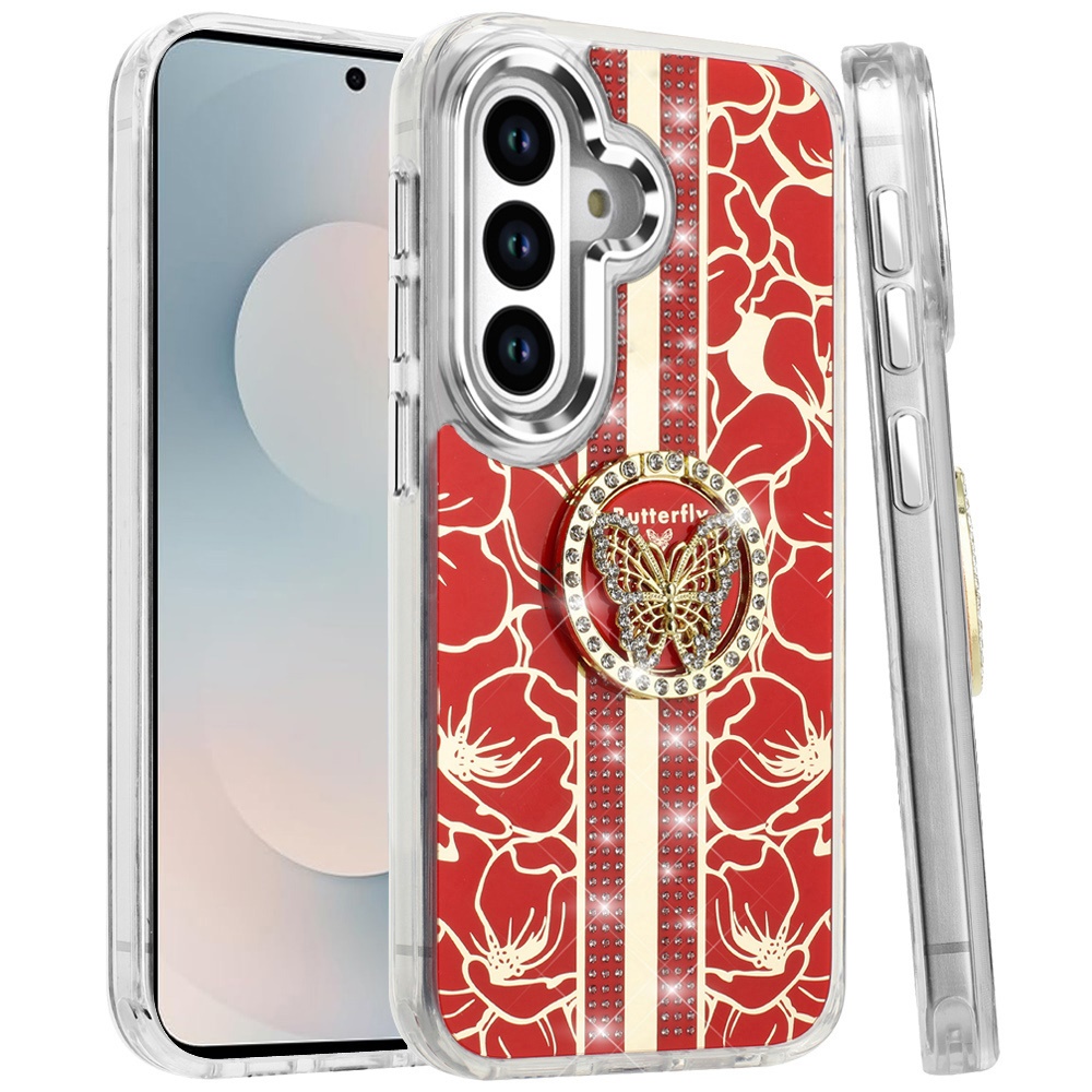 For Samsung s26 Plus Splendid Floral Designs with Metal Camera and Buttons with Butterfly Ring Stand Hybrid Case - Red