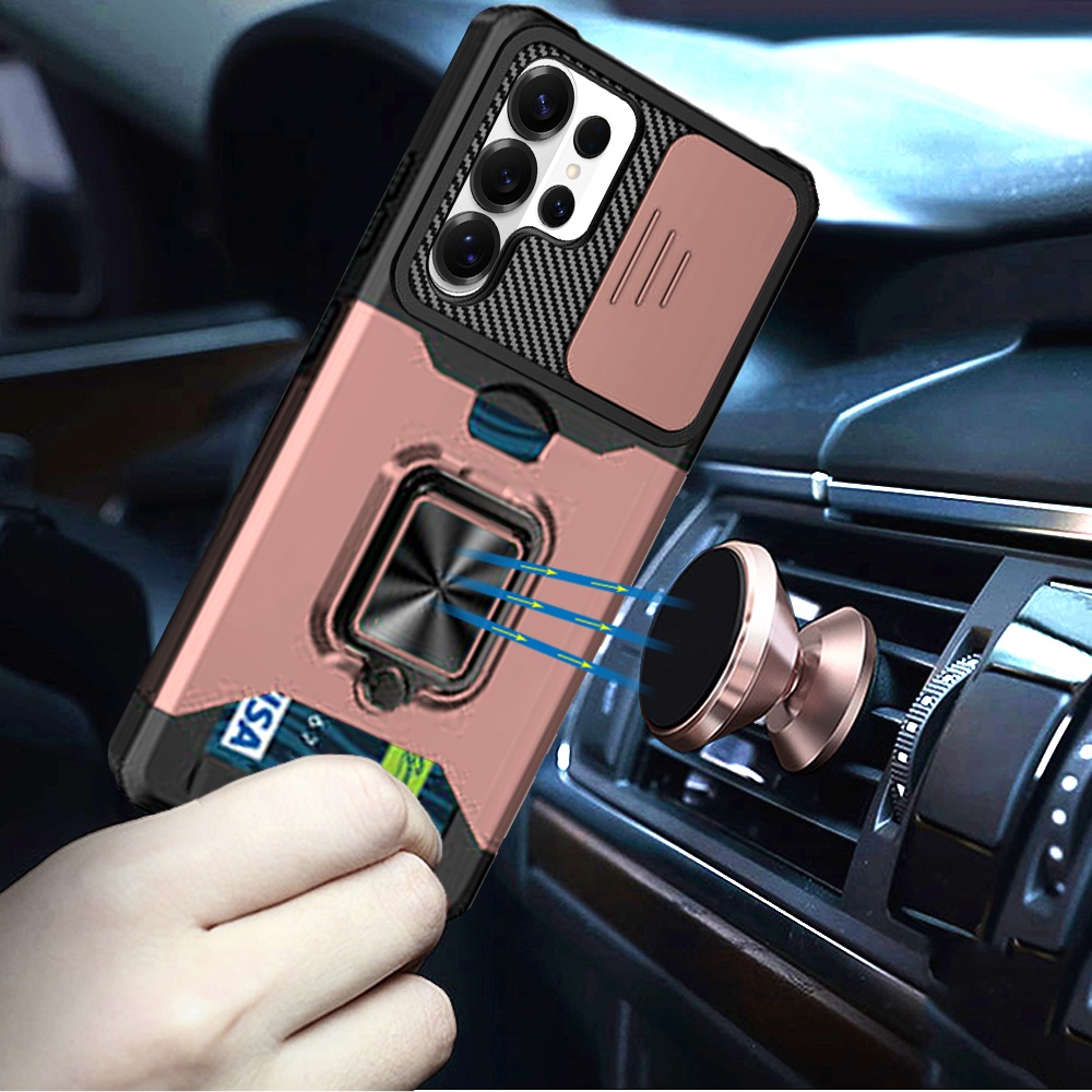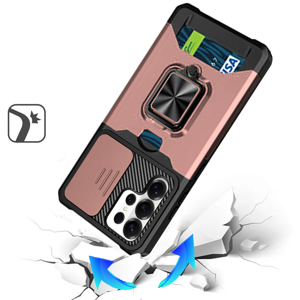 For Samsung s26 Ultra Multi-Functional Card Magnetic Ring Stand Hybrid Camera Case Cover - Rose Gold