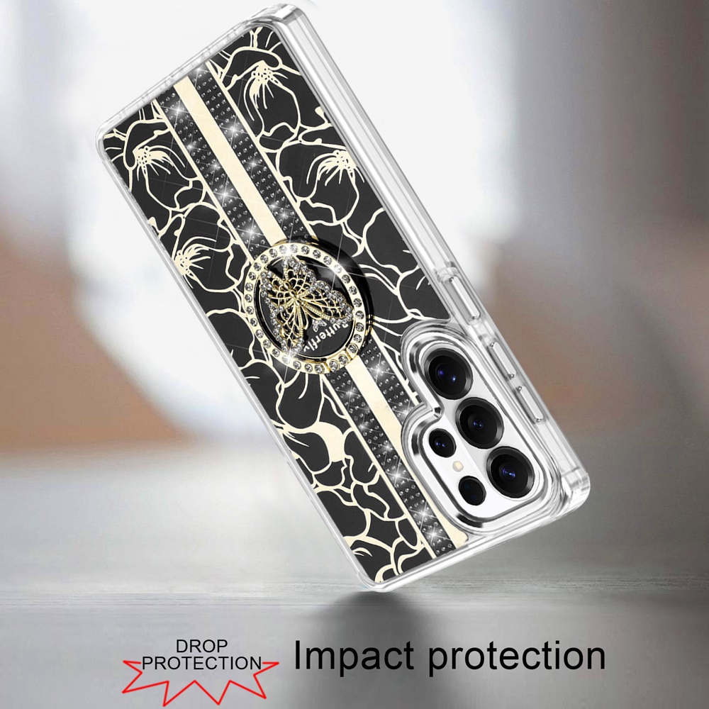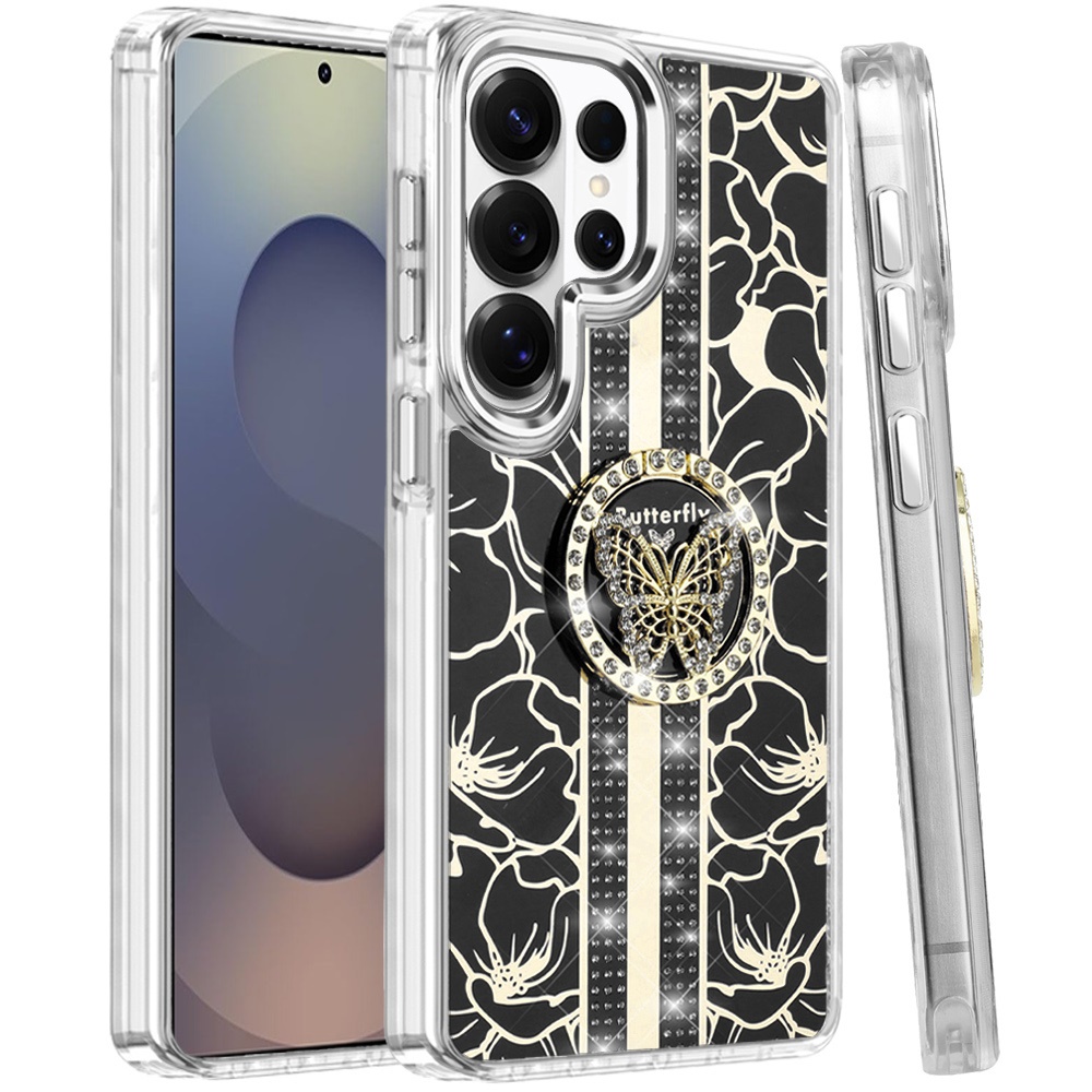 For Samsung s26 Ultra Splendid Floral Designs with Metal Camera and Buttons with Butterfly Ring Stand Hybrid Case - Black