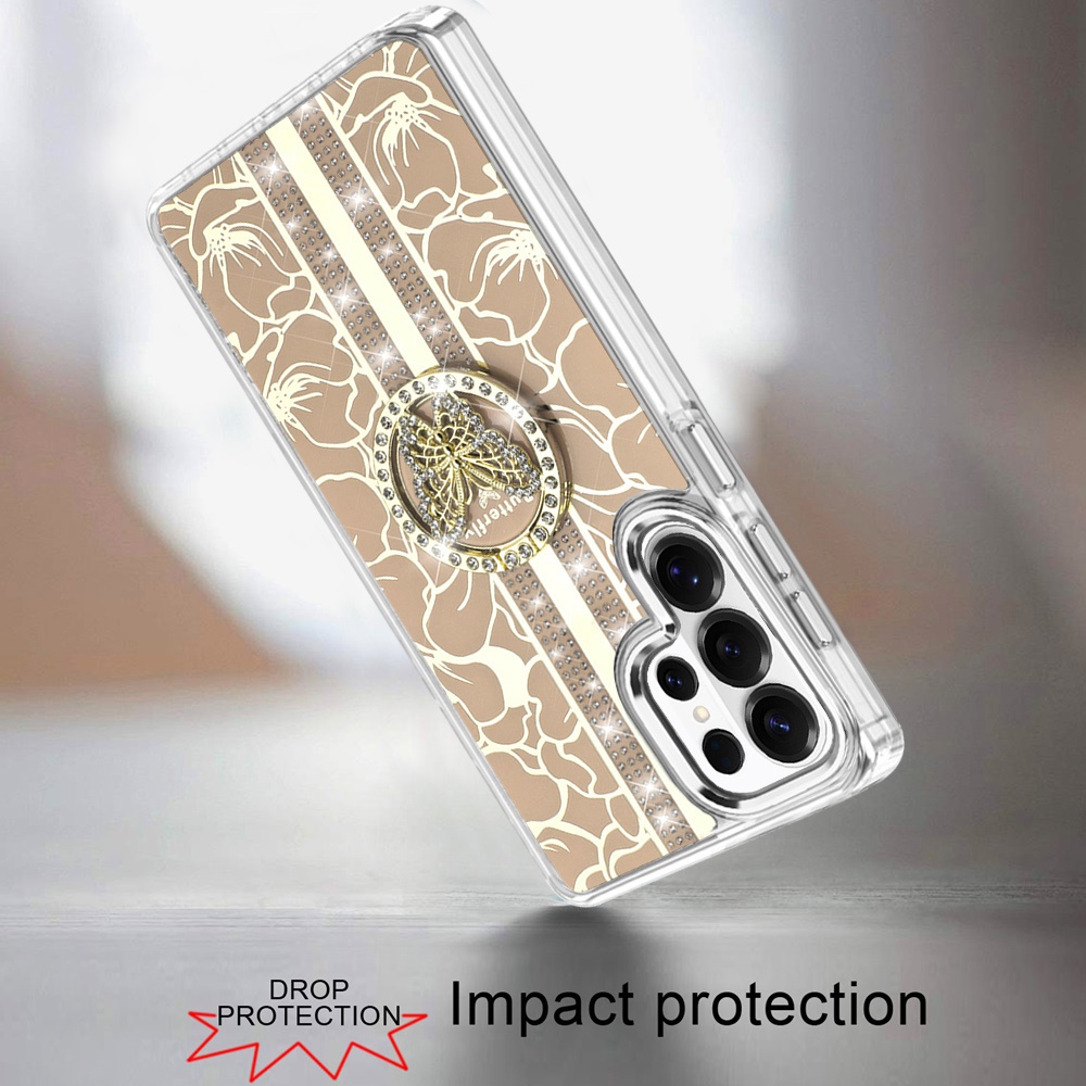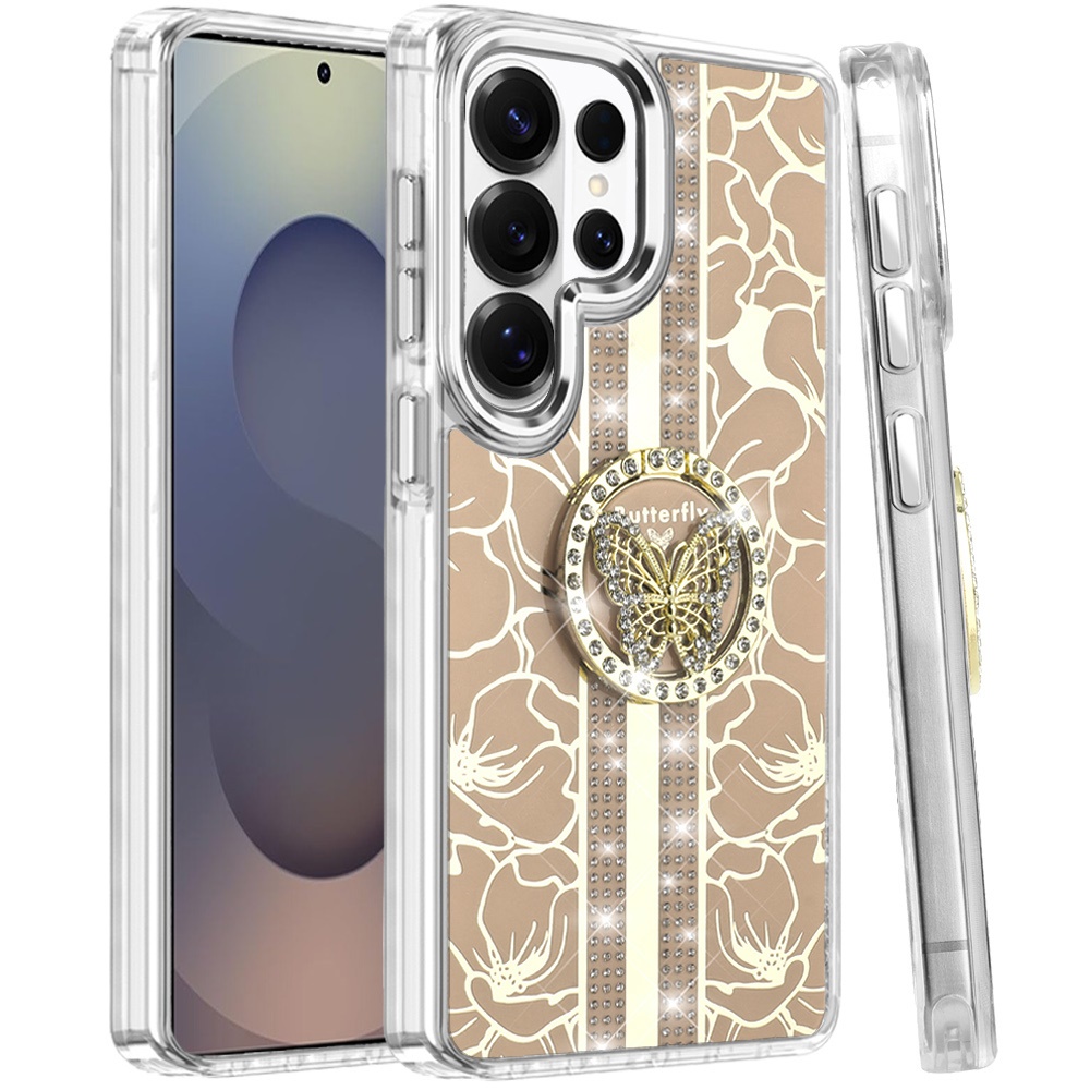 For Samsung s26 Ultra Splendid Floral Designs with Metal Camera and Buttons with Butterfly Ring Stand Hybrid Case - Gold