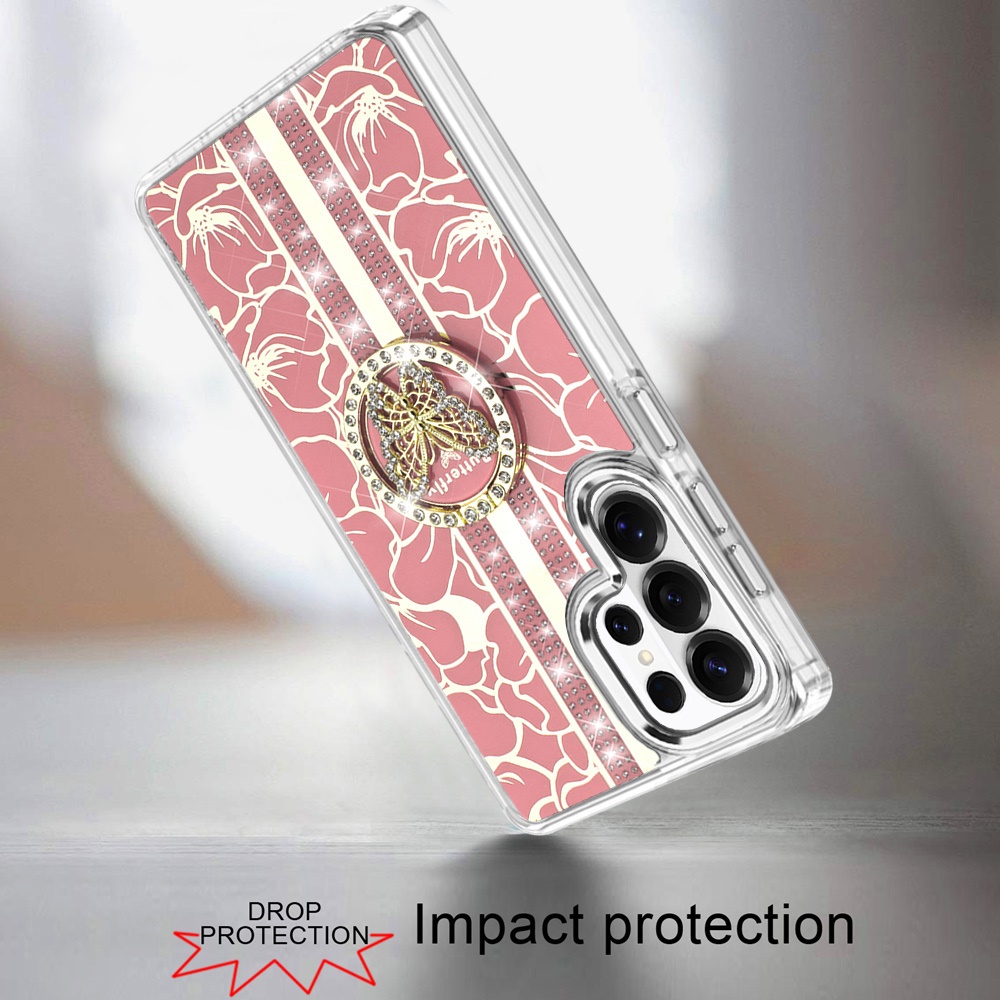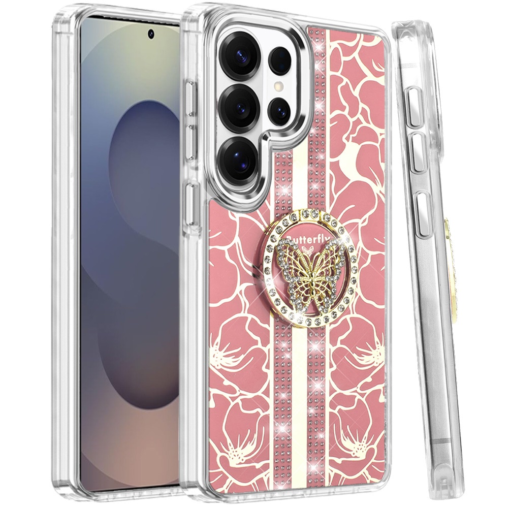 For Samsung s26 Ultra Splendid Floral Designs with Metal Camera and Buttons with Butterfly Ring Stand Hybrid Case - Light Pink
