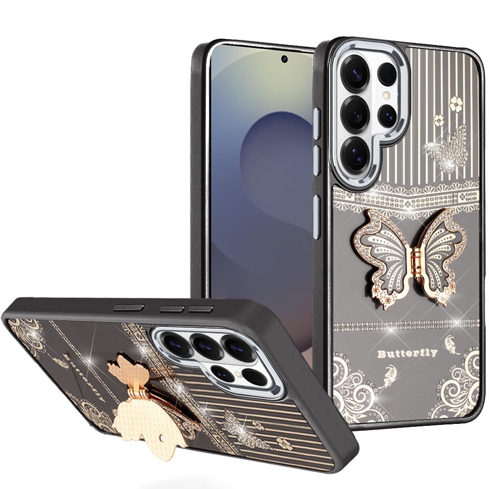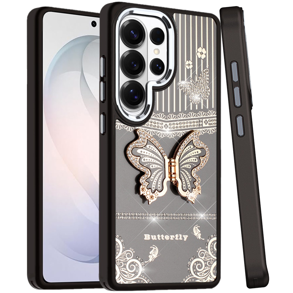 For Samsung s26 Ultra Splendid Glitter Butterfly Design Stand with Metallic Edges Hybrid Case - Black