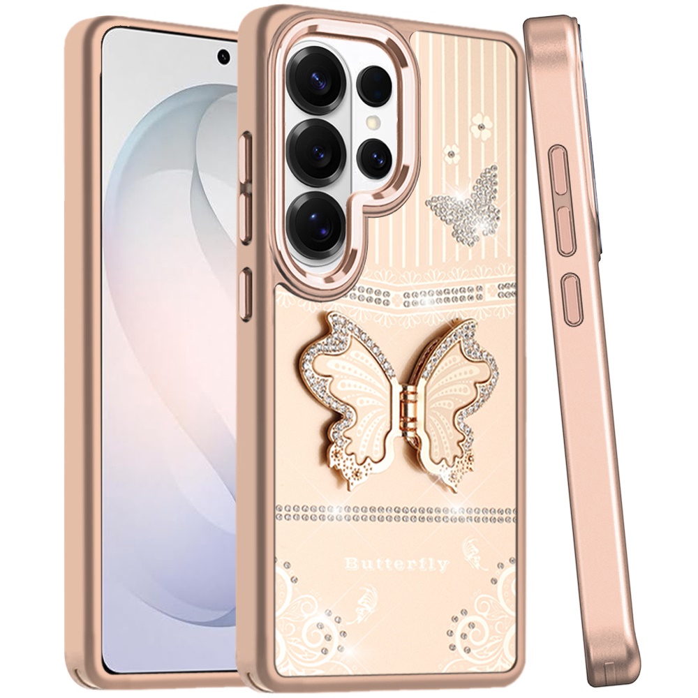 For Samsung s26 Ultra Splendid Glitter Butterfly Design Stand with Metallic Edges Hybrid Case - Gold