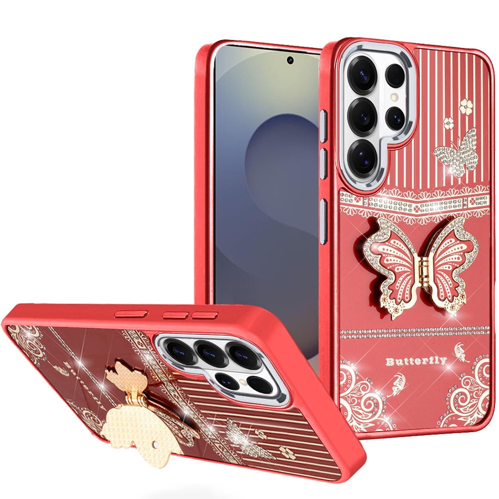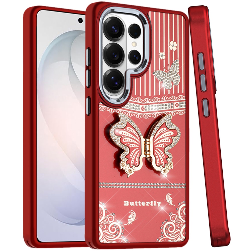 For Samsung s26 Ultra Splendid Glitter Butterfly Design Stand with Metallic Edges Hybrid Case - Red