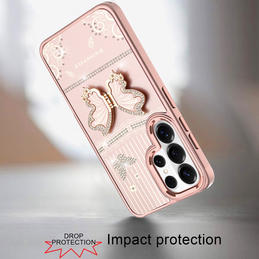 For Samsung s26 Ultra Splendid Glitter Butterfly Design Stand with Metallic Edges Hybrid Case - Rose Gold