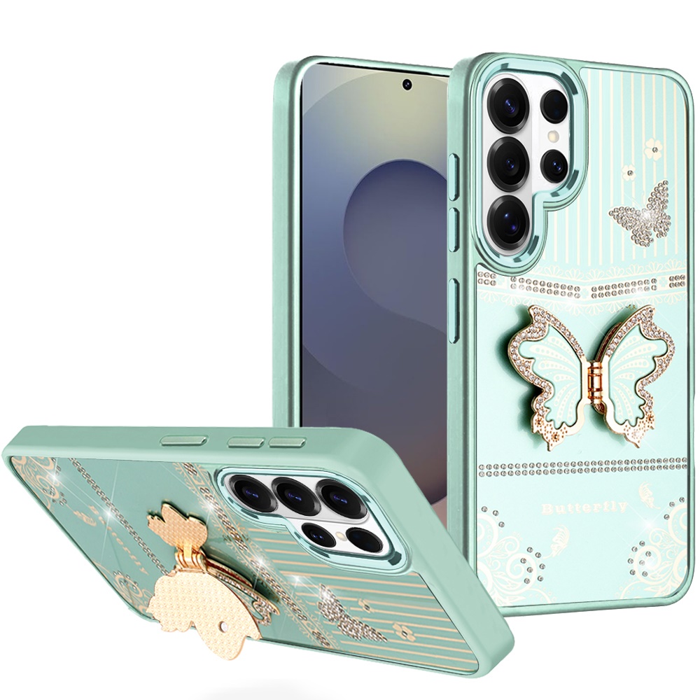 For Samsung s26 Ultra Splendid Glitter Butterfly Design Stand with Metallic Edges Hybrid Case - Teal