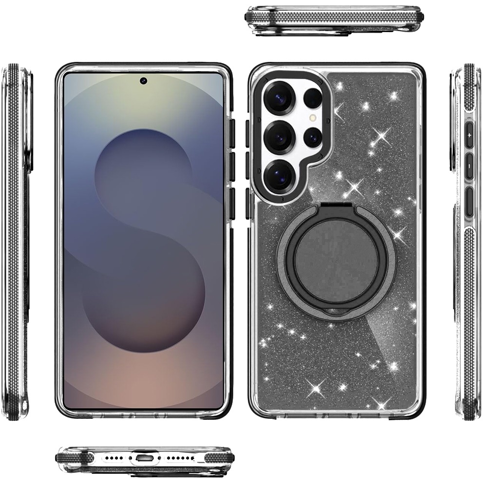 For Samsung s26 Ultra Glitz HQ Shimmer Glitter [Magnetic Ring Circle] with 360 degree Rotational Ring Kickstand Tough Hybrid Case - Black