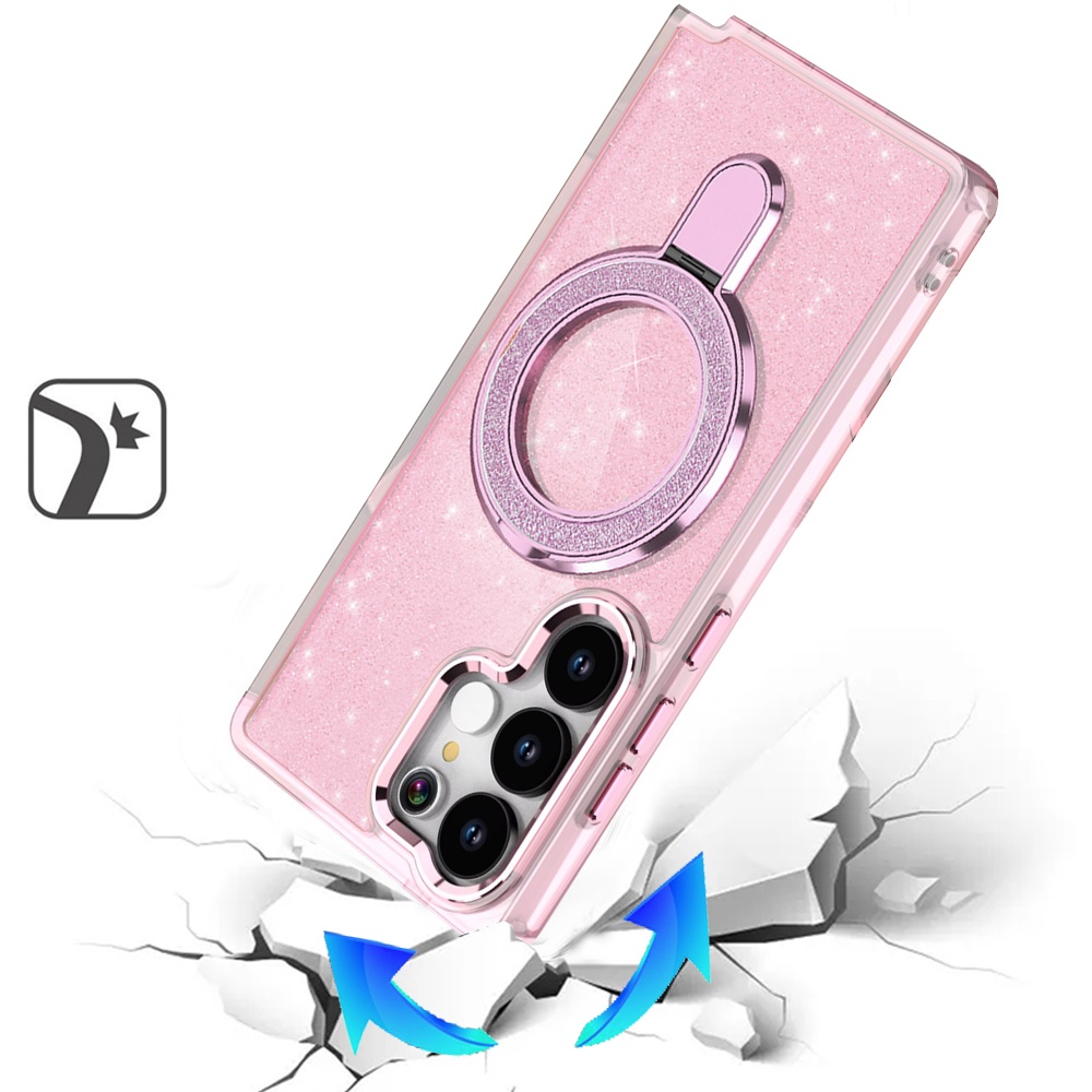 For Samsung s26 Ultra Transparent Glitter Rotaional Magnetic Ring Stand HQ Hybrid - Light Pink