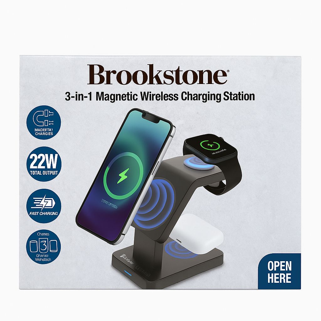Brookstone 3 in 1 Wireless Charging Station Compatible with MagSafe Charger for Apple Fast Wireless Charger Stand for iPhone 15,14,13,12 Pro Max Series, iWatch Series, Airpods 3, 2, Pro - Black (BK15-3M1D-BK) (D12-BROOKSTONE#2)