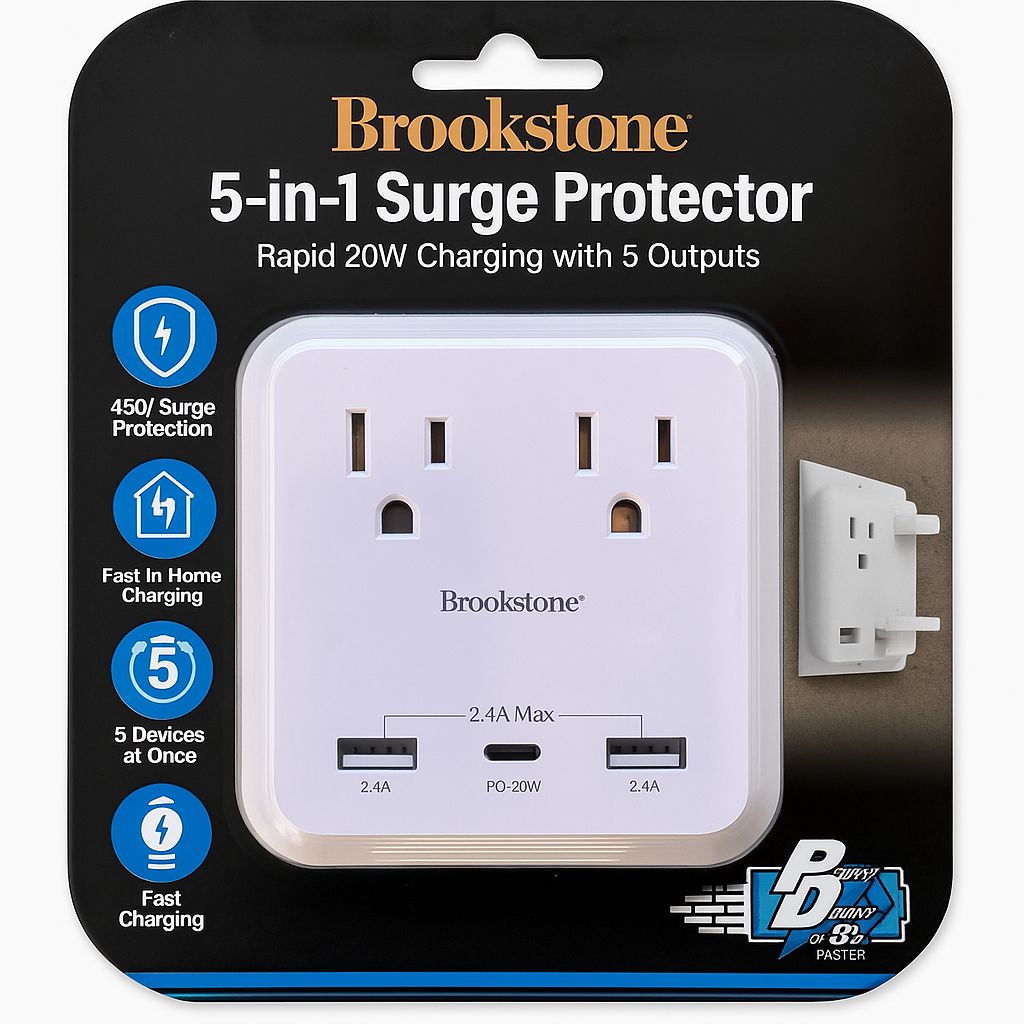 Brookstone 5-Port Surge Protector - Rapid 20W Charging with 5 outputs- 450j surge protection - BK16-5P221WS - WHITE (LANE D12 BROOKSTONE#10)