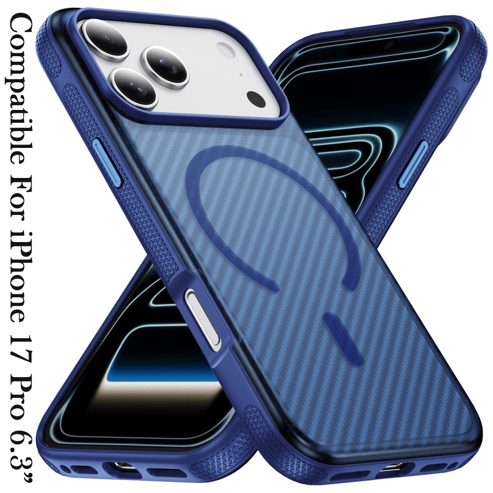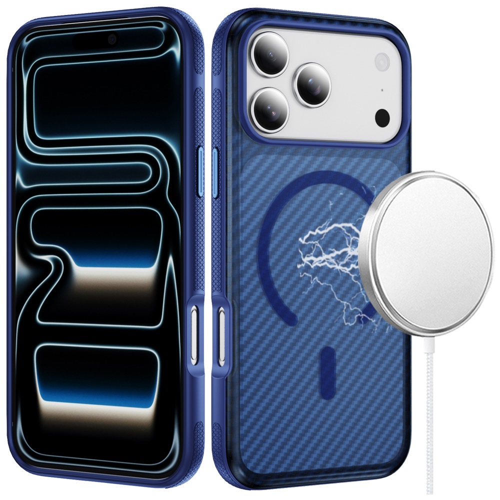 For iPhone 17 Pro Thick Carbon Design Magnetic Hybrid with Metallic Buttons Case - Blue