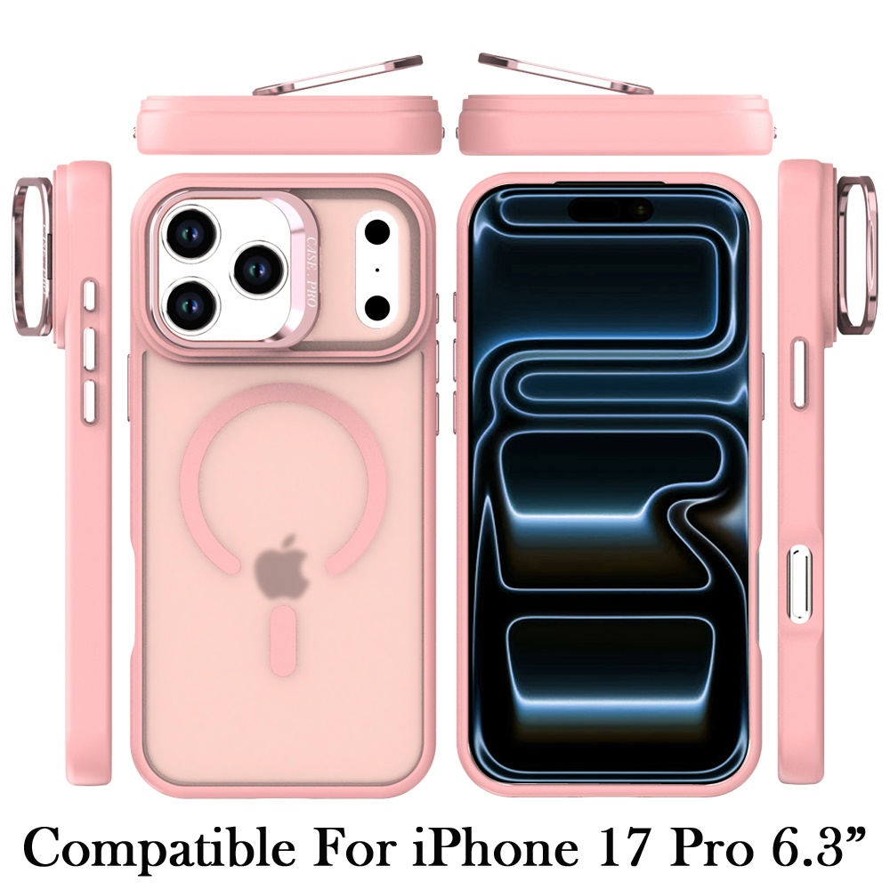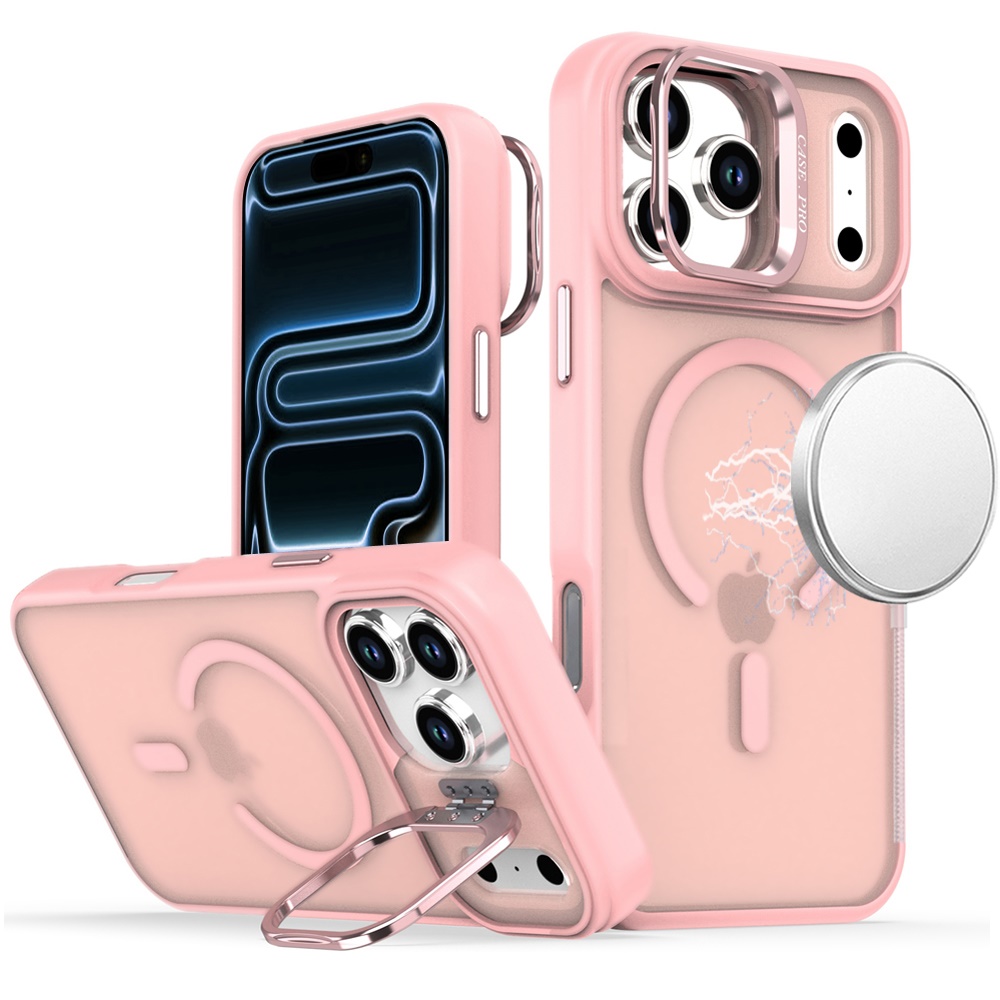 For iPhone 17 Pro Magnetic Matte Camera Metallic Stand Hybrid Case - Pink