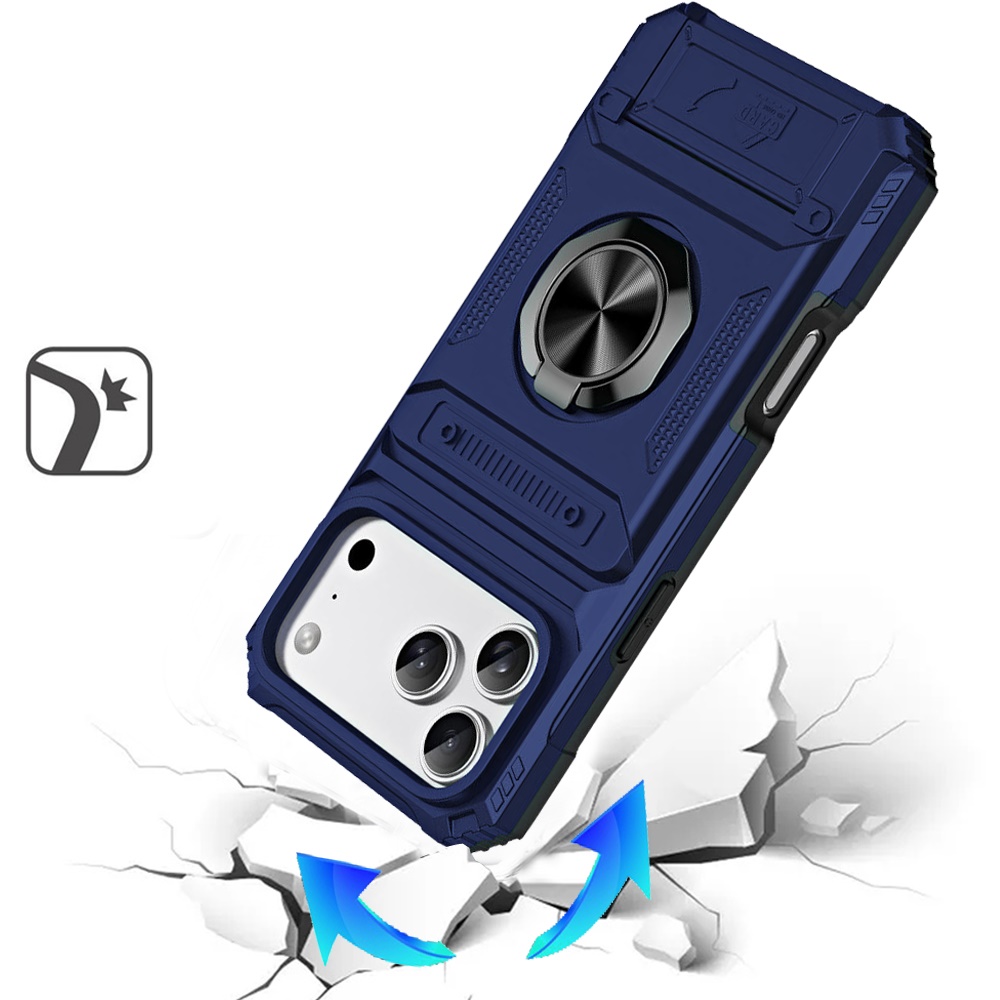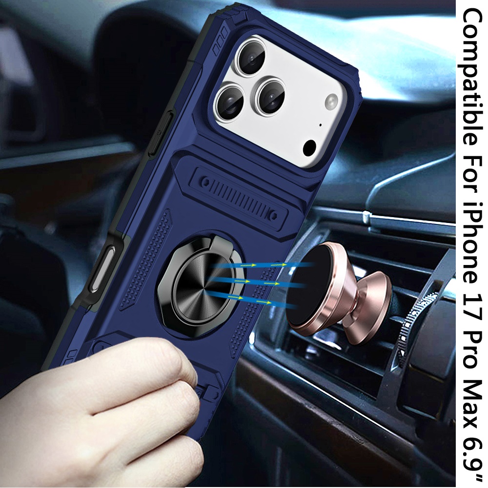 For iPhone 17 Pro Max Multi-Functional 2X Card Slot Shockproof Metal Ring Hybrid Case - Blue