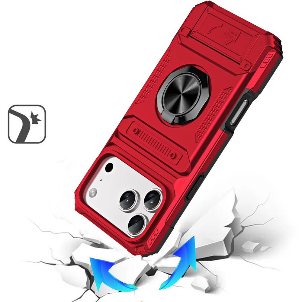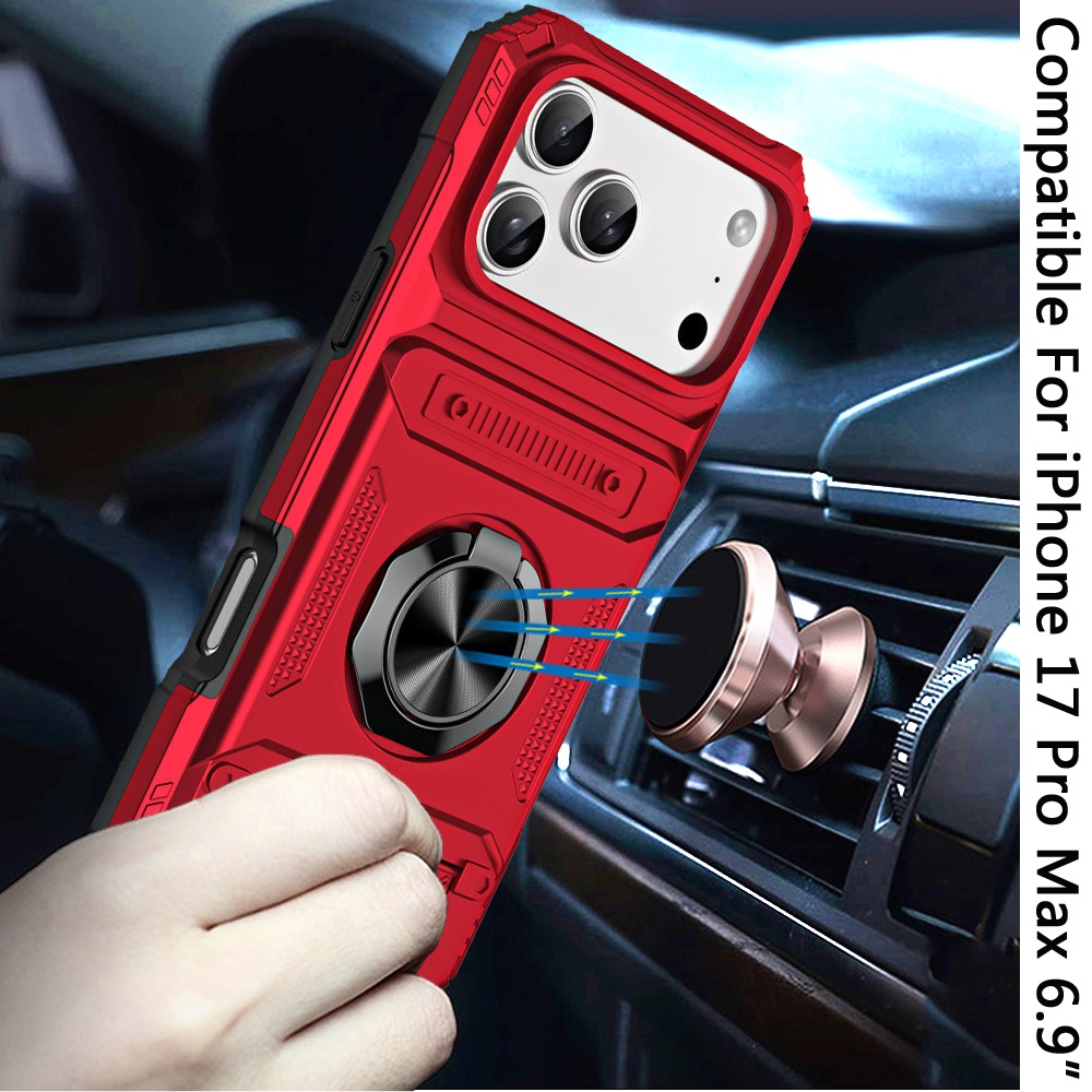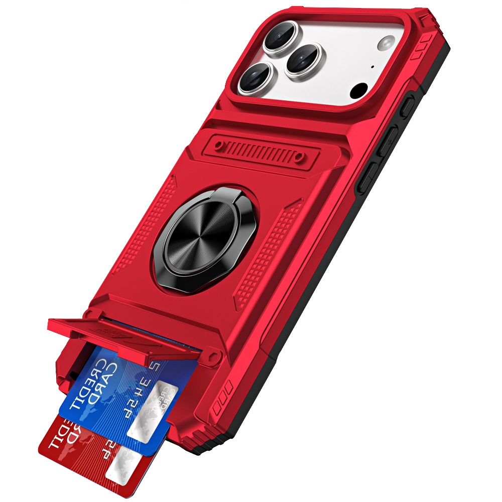 For iPhone 17 Pro Max Multi-Functional 2X Card Slot Shockproof Metal Ring Hybrid Case - Red